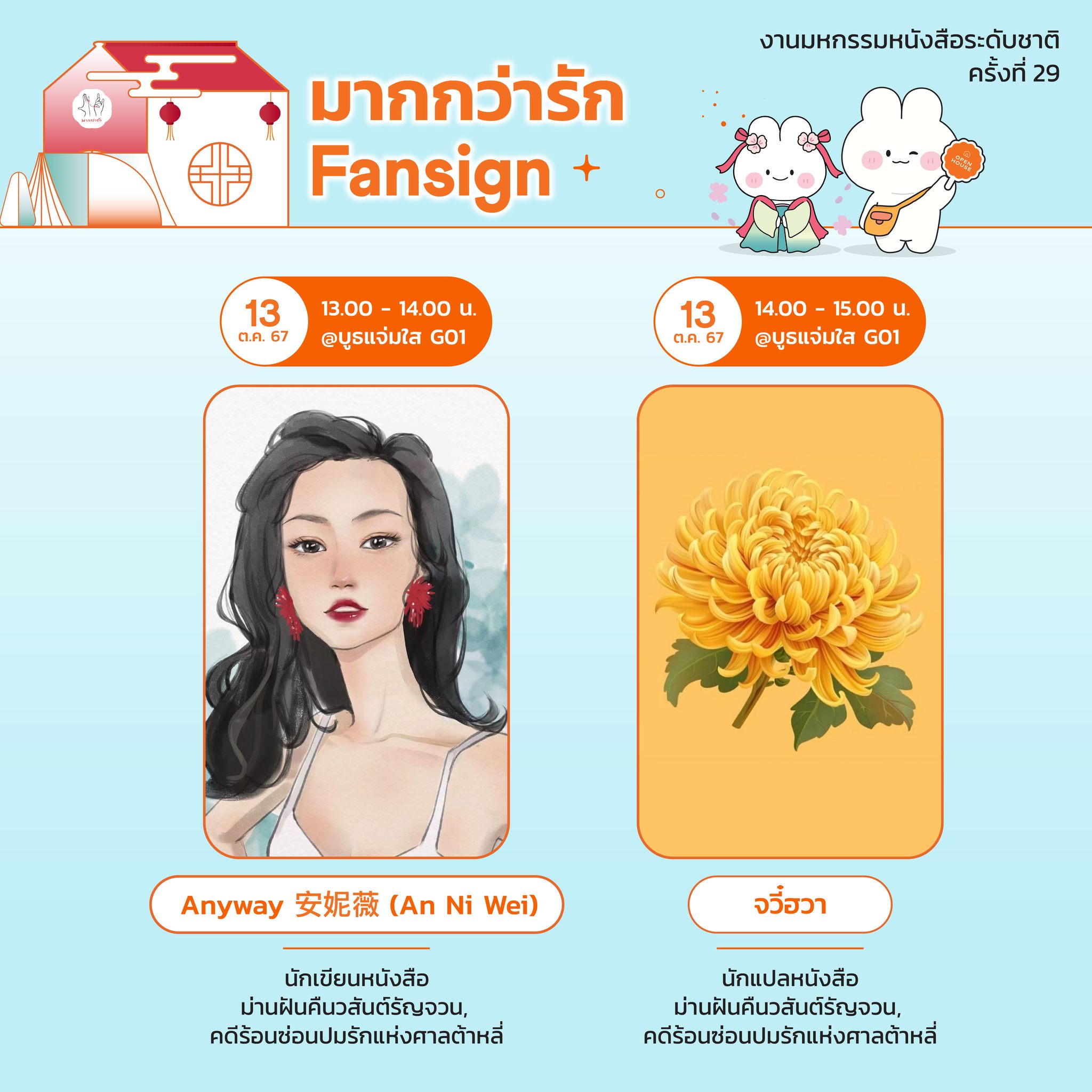 พลาดไม่ได้กับกิจกรรม Fansign กับโอกาสสุดพิเศษสำหรับสหายนักอ่านชาวไทย กับนักเขียนนิยายสุดร้อนแรง Anyway 安妮薇 (An Ni Wei) เจ้าของผลงานการเขียนเรื่อง คดีร้อนซ่อนปมรักแห่งศาลต้าหลี่ และม่านฝันคืนวสันต์รัญจวนที่บินลัดฟ้าจากประเทศจีนเพื่อมาพบกับแฟนๆ นักอ่าน รวมไปถึงนักแปล และนักวาดคนโปรดในดวงใจอีกหลายท่าน ที่จะมาพบปะกับนักอ่านกันอีกด้วย