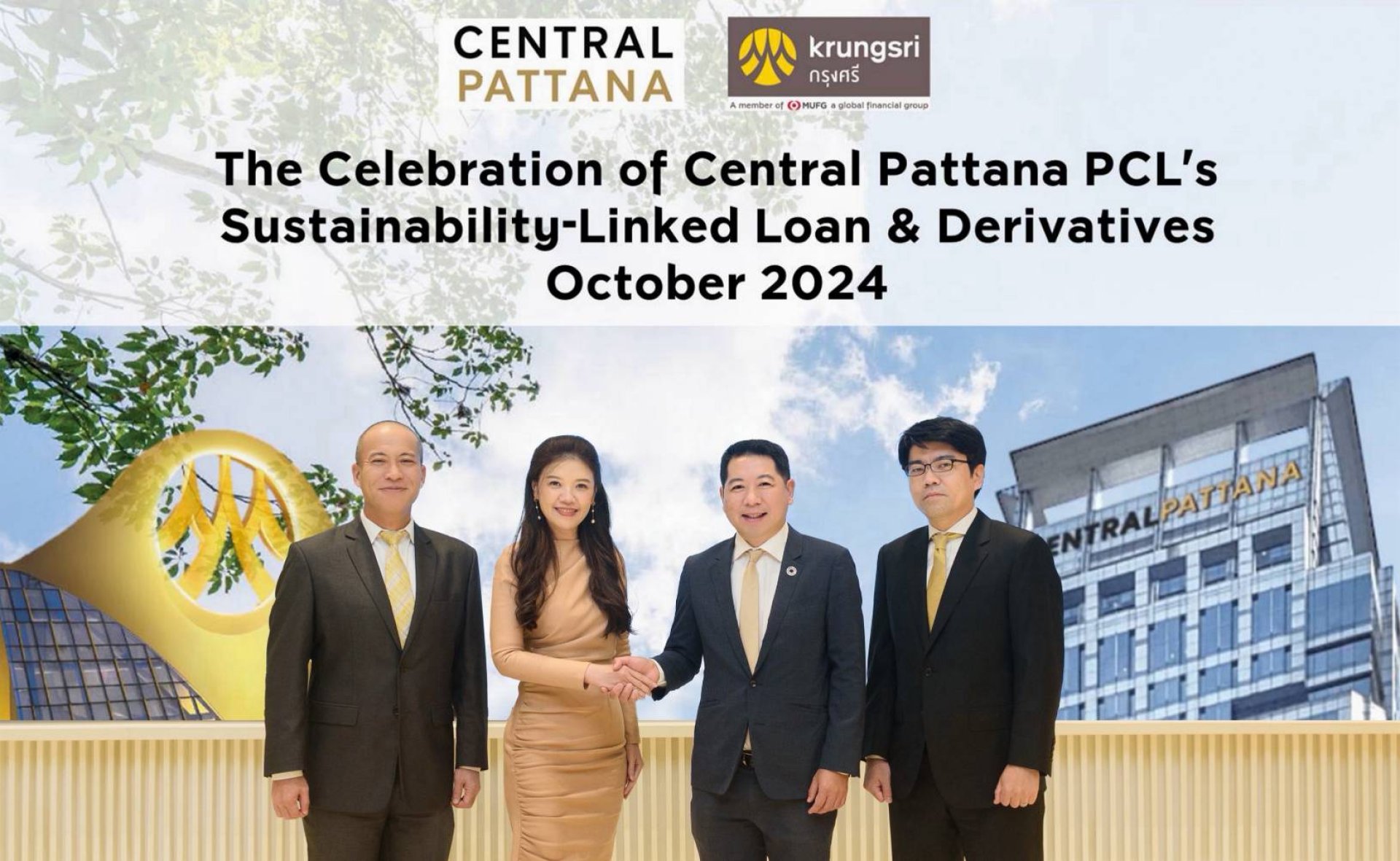 บริษัท เซ็นทรัลพัฒนา จำกัด (มหาชน) ผู้นำเบอร์หนึ่งอสังหาริมทรัพย์ไทยเพื่อความยั่งยืน และ กรุงศรี (ธนาคารกรุงศรีอยุธยา จำกัด (มหาชน)) ผสานความร่วมมือครั้งสำคัญเพื่อเดินหน้าสู่เป้าหมายด้านความยั่งยืน ผ่านสินเชื่อที่เชื่อมโยงกับการดำเนินงานด้านความยั่งยืน (Sustainability-Linked Loan: SLL) และสัญญาอนุพันธ์ป้องกันความเสี่ยงทางการเงินที่เชื่อมโยงกับการดำเนินงานด้านความยั่งยืน (Sustainability-Linked Derivatives) โดยความร่วมมือครั้งนี้เป็นไปตามพันธกิจของเซ็นทรัลพัฒนาและกรุงศรี ที่ต้องการบรรลุเป้าหมายการลดการปล่อยก๊าซเรือนกระจกสุทธิเป็นศูนย์ในปี พ.ศ. 2593