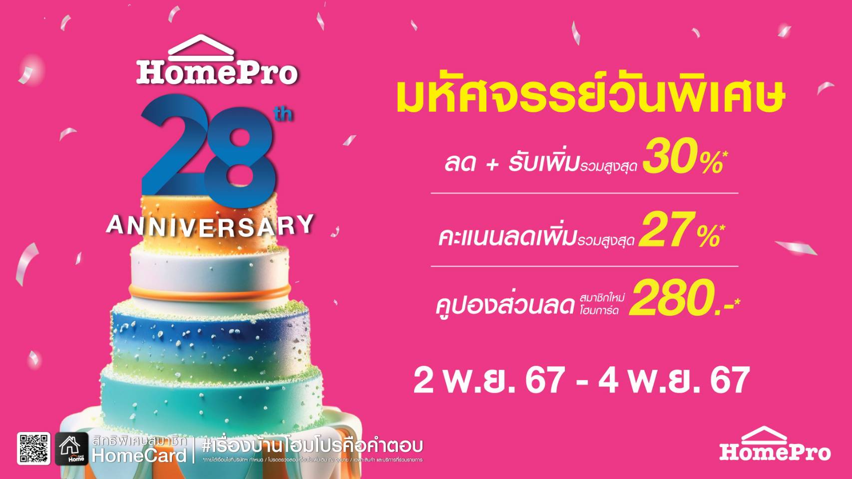 "โฮมโปร" ฉลองครบรอบ 28 ปี จัดแคมเปญ HomePro 28th Anniversary 8 WONDERS มหัศจรรย์ทุกสัปดาห์ มหกรรมช้อปสุดคุ้ม! ที่พร้อมส่งต่อสิทธิประโยชน์มากมาย 8 สัปดาห์เต็ม ให้กับผู้บริโภค เริ่มพฤศจิกายนนี้ เสิร์ฟมหัศจรรย์วันพิเศษ 2 พ.ย. 67-4 พ.ย. 67 รับสิทธิพิเศษเฉพาะ! สมาชิกโฮมการ์ด รับส่วนลด+รับเพิ่มรวมสูงสุด 30% / คูปองส่วนลดสุดคุ้ม รวมมูลค่าสูงสุด 2,300 บาท ที่ Line HomePro / ใช้คะแนนแทนส่วนลดรวมสูงสุด 27% พร้อมรับความพิเศษตลอดสัปดาห์แรก 1 พ.ย. 67 7 พ.ย. 67 กับขบวนสินค้าราคาพิเศษจากแบรนด์ชั้นนำมากมาย พร้อมสิทธิ์ Super Wonder, Super Zero ผ่อนนาน ผ่อนน้อย ได้ทั้งร้าน เมื่อช้อปตั้งแต่ 2,000 บาทขึ้นไปต่อใบเสร็จ และผ่อน 0% นาน 3 เดือน หรือเลือกผ่อนสบายนานสูงสุด 24 เดือน กับบัตรเครดิตและบัตรสินเชื่อที่ร่วมรายการ เตรียมรับความสุขต่อเนื่องถึงสิ้นปี กับช่วงเวลาแห่งการเฉลิมฉลอง HomePro 28th Anniversary 8 WONDERS มหัศจรรย์ทุกสัปดาห์ ตั้งแต่วันนี้-31 ธันวาคม 2567 ที่โฮมโปรทุกสาขาและช้อปออนไลน์