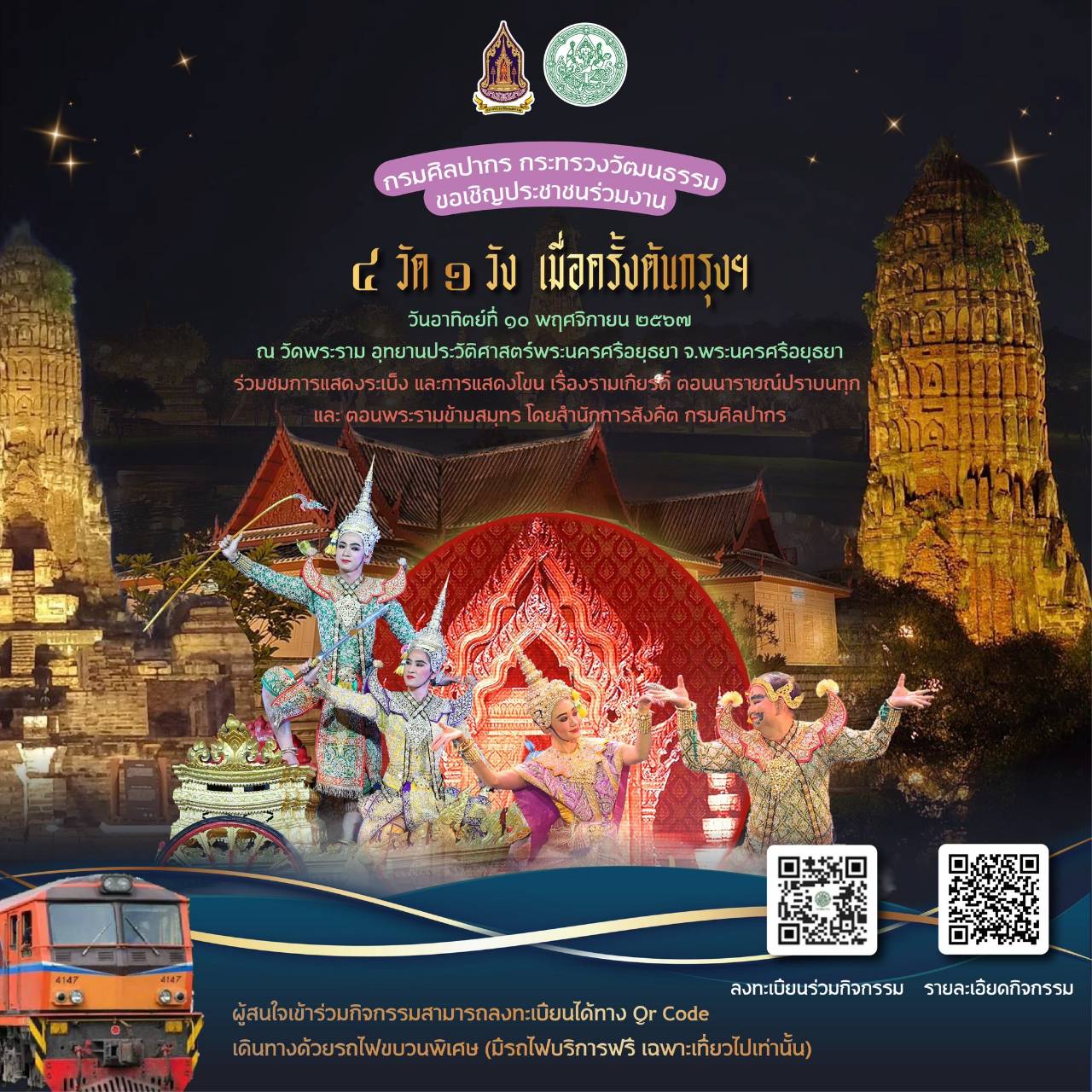 อย่าพลาดโอกาสสำคัญในครั้งนี้ มาร่วมเดินทางย้อนเวลากลับไปสู่ช่วงต้นกรุงศรีอยุธยา พร้อมทั้งดื่มด่ำกับบรรยากาศโบราณสถานยามค่ำคืน ได้ที่งาน "4 วัด 1 วัง เมื่อครั้งต้นกรุงฯ" ในวันที่ 9 - 17 พฤศจิกายน 2567 ที่จังหวัดพระนครศรีอยุธยา ตั้งแต่เวลา 18.00 น. เป็นต้นไป สอบถามรายละเอียดเพิ่มเติมได้ที่เพจเฟซบุ๊ก อุทยานประวัติศาสตร์พระนครศรีอยุธยา Ayutthaya Historical Park