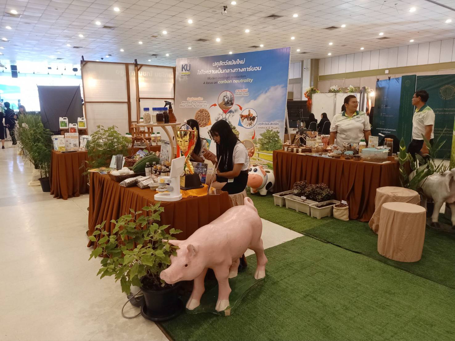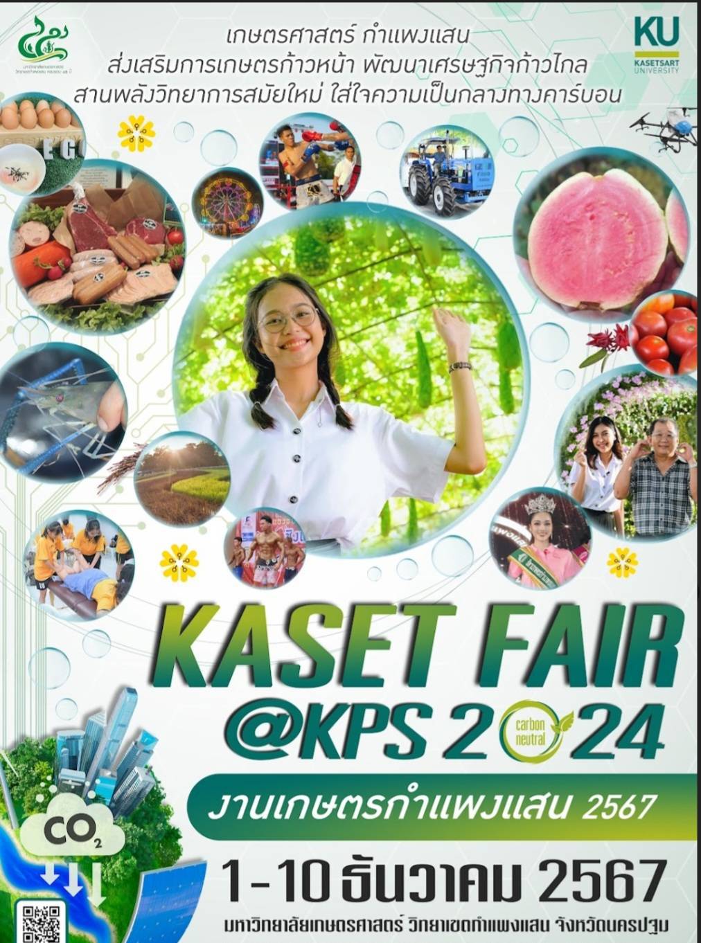 ผู้ช่วยศาสตราจารย์ ว่าที่ร้อยตรี ดร.ศิริชัย ศรีพรหม ผู้ช่วยอธิการบดีฝ่ายบริหาร กีฬา และศิลปวัฒนธรรม วิทยาเขตกำแพงแสน กล่าวถึงกิจกรรมที่จะเกิดขึ้นในงานเกษตรกำแพงแสน ประจำปี 2567 ว่า มหาวิทยาลัยเกษตรศาสตร์ วิทยาเขตกำแพงแสน เป็นมหาวิทยาลัยแห่งนวัตกรรม การเกษตร สุขภาพ และสิ่งแวดล้อม ที่ตระหนักถึงปัญหาการปล่อยก๊าซคาร์บอนไดออกไซด์หรือก๊าซเรือนกระจกที่ก่อให้เกิดภาวะโลกร้อน ซึ่งส่งผลเสียต่อระบบนิเวศน์และมนุษย์เป็นอย่างมาก จึงกำหนดรูปแบบในการจัดงานเพื่อนำเสนอผลงานนวัตกรรมจากงานวิจัยและบริการวิชาการ รวมไปถึงกิจกรรมเผยแพร่องค์ความรู้ของมหาวิทยาลัยเกษตรศาสตร์ วิทยาเขตกำแพงแสน ที่มุ่งสู่ความเป็นกลางทางคาร์บอน หรือ Carbon neutrality โดยมีการนำเสนอผลงานที่น่าสนใจมากมาย ผ่านการจัดแสดงนิทรรศการผลงานวิจัย นวัตกรรม และบริการวิชาการ พบกับผักและผลไม้สายพันธุ์ใหม่ จากงานวิจัยด้านพืชและวิทยาศาสตร์เกษตร ฝรั่งพันธุ์ใหม่ ชมพูพิรุณ เทคโนโลยีการเกษตรที่สนับสนุนการผลิตพืชในยุคดิจิทัล มหกรรมแทรกเตอร์และเครื่องจักรกลเกษตรไทย การจัดแสดงสายพันธุ์ข้าวรวม 102 สายพันธุ์ ในงาน นิทรรศการพันธุ์ข้าวแห่งชาติ (National Rice Field Day 2024) ชมนิทรรศการด้านปศุสัตว์และเลือกซื้อผลิตภัณฑ์เนื้อโคอินทรีย์ (Kaset Organic Beef) ไก่ตะเภาทอง ผลิตภัณฑ์ยาสมุนไพรรักษาสัตว์ นิทรรศการด้านประมง พบกับการผลิตกุ้งก้ามกรามเพศผู้ล้วน นวัตกรรมการผลิตปูม้านิ่ม ผลิตภัณฑ์รักษ์โลกจากกาวหนังปลา-Eco-Art นิทรรศการงานวิจัยและนวัตกรรมด้านวิศวกรรมศาสตร์ เครื่องอัดกระถางปลูกแคคตัสรักษ์โลก เครื่องวิเคราะห์รสชาติเนื้อทุเรียนแบบไม่ทำลายเนื้อ ทุเรียน ตามสั่งดั่งใจ