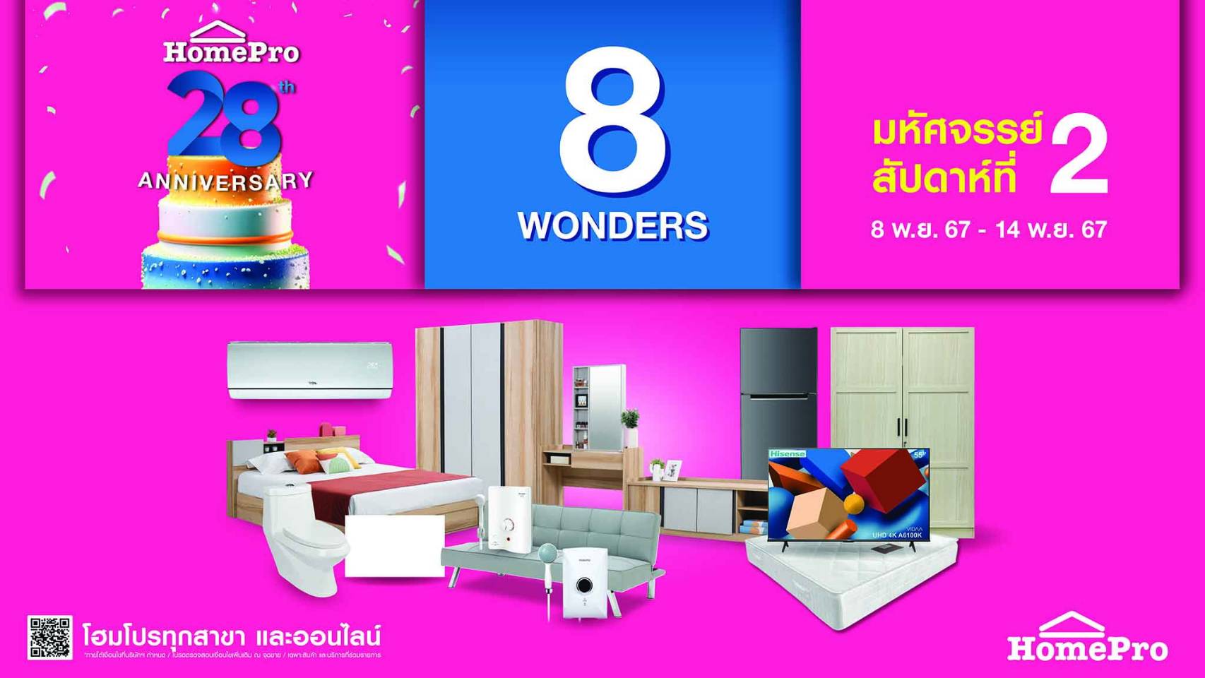 "โฮมโปร" ชวนสัมผัสความมหัศจรรย์สัปดาห์ที่ 2 แห่ง "8 WONDERS" ในแคมเปญ "HomePro 28th Anniversary" มหัศจรรย์ทุกสัปดาห์ เตรียมพบกับนานาความพิเศษจากแบรนด์ดังสินค้าเรื่องบ้าน มาให้เลือกสรรครบ จบ ทุกความต้องการ เริ่มวันที่ 8 พฤศจิกายน 2567- 14 พฤศจิกายน 2567 นี้ อัดแน่นความสุข ลดแรงส์ทุกชิ้น! หมดแล้ว...หมดเลย รีบช้อปก่อนใคร ไม่ว่าจะเป็น