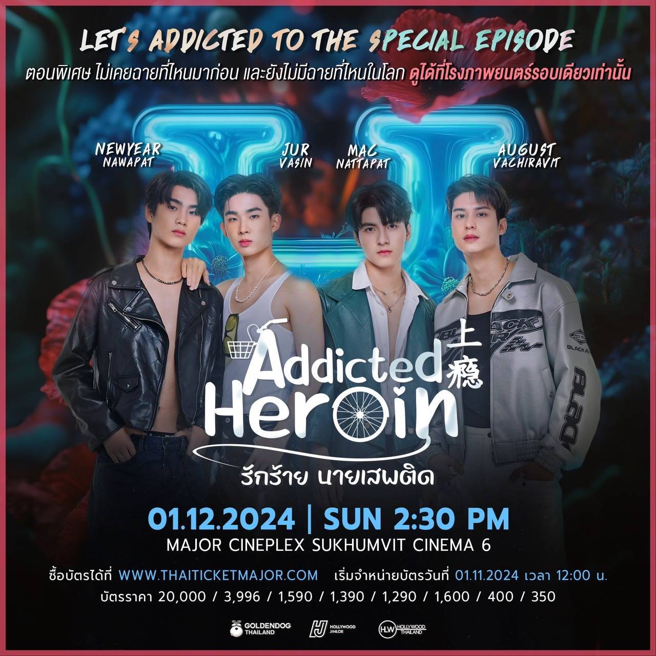 แต่!!! ความฟินไม่ได้จบลงเพียงแค่นั้น เมื่อทางค่าย Golden Dog Thailand ร่วมกับ Hollywood (Thailand) และค่าย HJ Thailand (Hollywood Jinloe) จับมือทำเซอร์ไพรส์จัดกิจกรรมดูตอนพิเศษแบบเต็มตาในโรงภาพยนตร์ เอาใจแฟน ๆ ให้ได้ฟินส่งท้ายกันสด ๆ ไปพร้อมกับเหล่านักแสดงนำทั้ง 4 หนุ่ม "ออกัส-แม็ค-นิวเยียร์-เจ๋อ" และนักแสดงคนอื่น ๆ อีกคับคั่ง โดยจะจัดขึ้นในวันอาทิตย์ที่ 1 ธันวาคม 2567 ณ Major Cineplex Sukhumvit (เมเจอร์ ซินิเพล็กซ์ สุขุมวิท) วันเดียวรอบเดียวเท่านั้น! ภายในงานนอกจากแฟนคลับของนักแสดงนำทั้ง 4 หนุ่ม 4 บ้าน จะได้ร่วมชมตอนพิเศษพร้อมกันแล้ว ยังมีสิทธิพิเศษอีกมากมายที่จะได้รับภายในงาน บอกคำเดียวว่า ห้ามพลาด! สามารถกดซื้อบัตรได้แล้ววันนี้ที่ช่องทาง https://m.thaiticketmajor.com/performance/addicted-heroin-the-special-episode.html