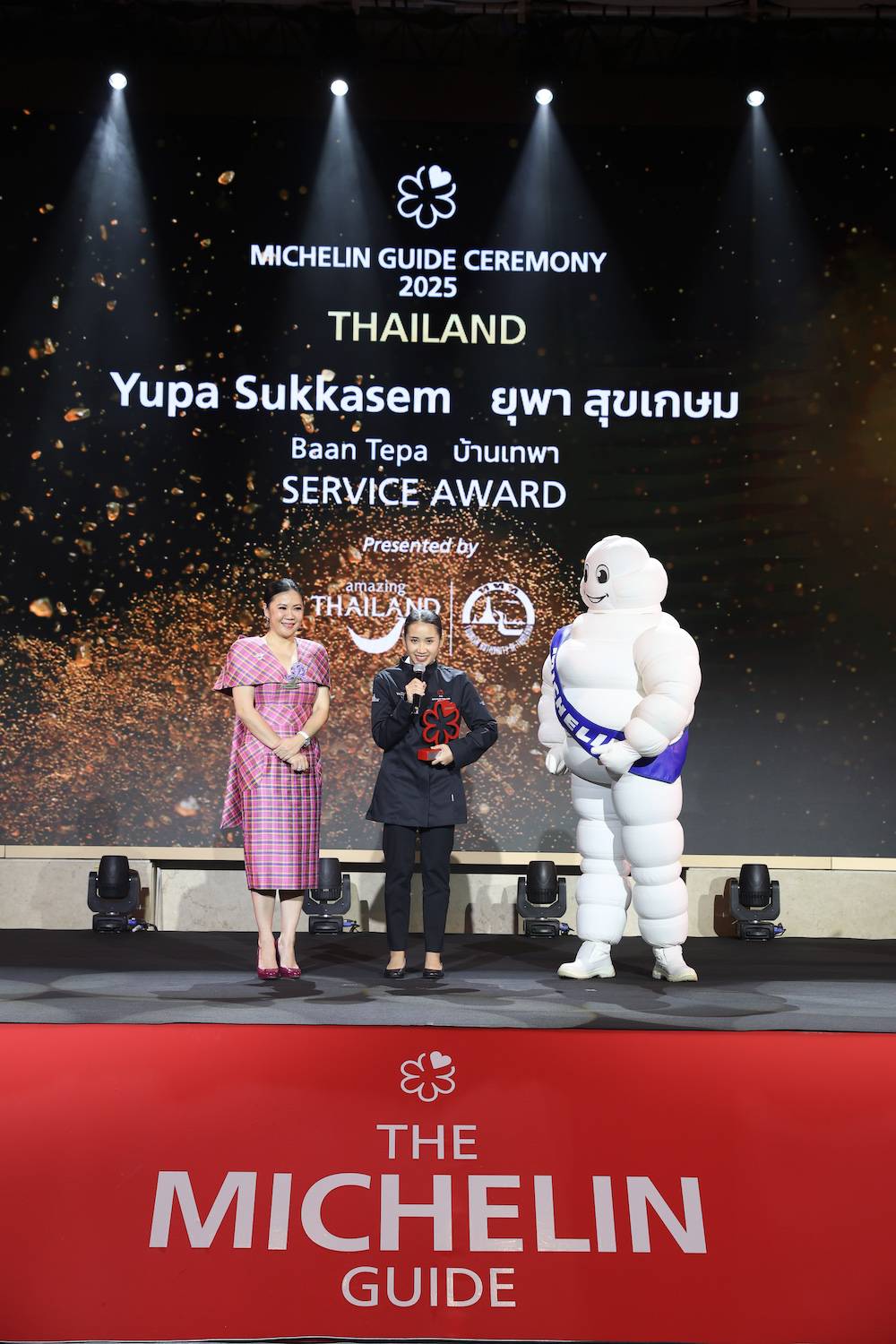 MICHELIN Guide Service Award เป็นรางวัลที่ได้รับการสนับสนุนโดยการท่องเที่ยวแห่งประเทศไทย มอบให้สุดยอดบุคลากรของร้านอาหารที่ทุ่มเทให้กับการบริการเพื่อให้ลูกค้าได้สัมผัสประสบการณ์การทานอาหารที่ยอดเยี่ยม สำหรับผู้ได้รับรางวัลประจำปี 2568 คือ ยุพา สุขเกษม ผู้จัดการร้านบ้านเทพา ด้วยประสบการณ์ที่สั่งสมมานานถึง 6 ปี จากการทำงานในอุตสาหกรรมอาหารและเครื่องดื่ม คุณยุพาให้บริการอย่างมืออาชีพด้วยความใส่ใจ การให้บริการของเธอและทีมงานสร้างความประทับใจให้กับทีมผู้ตรวจสอบของ มิชลิน ไกด์ และทำให้การรับประทานอาหารเป็นประสบการณ์ที่น่าจดจำ