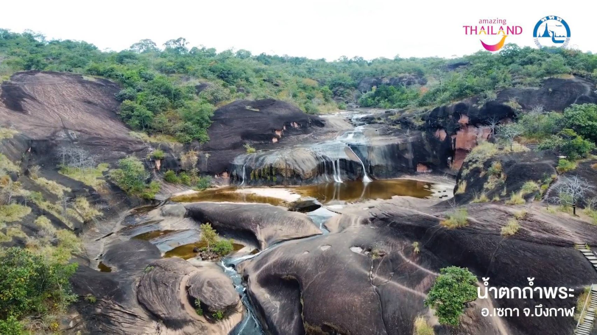 เริ่มต้นกันที่ "น้ำตกถ้ำพระ" หรือ "น้ำตกถ้ำพระภูวัว" ตั้งอยู่บริเวณเขตรักษาพันธุ์สัตว์ป่าภูวัว บ้านถ้ำพระ ตำบลโสกก่าม อำเภอเซกา จังหวัดบึงกาฬ เป็นน้ำตกขนาดใหญ่ 3 ชั้น ที่ไหลอยู่บนภูเขาหินทรายขนาดใหญ่ และด้วยความที่เป็นหินทรายแบบนี้ทำให้ลักษณะของน้ำตกมีความสวยงามแปลกตาไม่เหมือนที่ไหนๆ สำหรับสายถ่ายรูปแล้ว นี่คือมุมอันซีนที่ห้ามพลาด