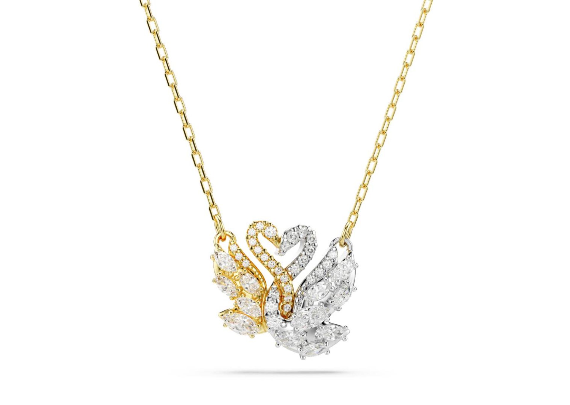 การใช้วัสดุที่หลากหลาย และสีที่ตัดกันสร้างความสดใหม่ให้กับสัญลักษณ์อันแสนคลาสสิกที่เป็นไฮไลท์ของคอลเลกชันนี้ โดยหงส์ตัวหนึ่งเคลือบทอง และอีกตัวเคลือบโรเดียม โดยหงส์ทั้งสองตัวประดับด้วยอัญมณี Swarovski Zirconia pavé ที่เปล่งประกายแวววาว แขวนอยู่บนสายโซ่ทองคำโทนอุ่น