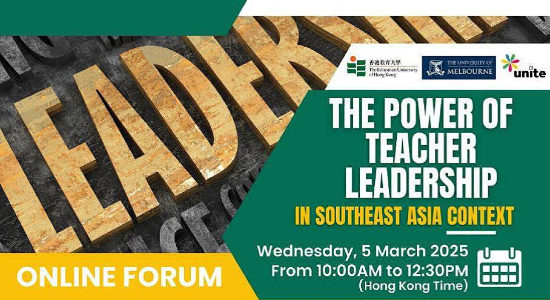 สถาบันพัฒนาการศึกษาและนวัตกรรม มหาวิทยาลัยการศึกษาเขตบริหารพิเศษฮ่องกง สาธารณรัฐประชาชนจีน และ คณะศึกษาศาสตร์ มหาวิทยาลัยเมลเบิร์น ประเทศออสเตรเลีย ร่วมกับ กลุ่ม Unite Thailand ขอเชิญผู้นำทางวิชาการ, ครู, นักวิชาการ และผู้ที่สนใจทุกท่าน เข้าร่วมฟังการประชุมออนไลน์ (ภาษาอังกฤษ) เรื่อง "พลังของผู้นำทางวิชาการ ในบริบทของเอเชียตะวันออกเฉียงใต้" ซึ่งการประชุมฯ ครั้งนี้มีที่มาจาก "การศึกษา" ที่เปลี่ยนแปลงไปในเอเชียตะวันออกเฉียงใต้ ทำให้มีความต้องการผู้นำทางวิชาการ หรือครู ในการบริหารจัดการกับห้องเรียนที่หลากหลาย และมีความแตกต่างทางวัฒนธรรม ซึ่งในการประชุมครั้งนี้จะช่วยทำให้ผู้นำทางวิชาการ สามารถเป็นผู้นำในสภาพแวดล้อมที่ท้าทาย ส่งเสริมการเติบโตทางอาชีพและผลลัพธ์ของนักเรียน รวมถึงจะได้รับข้อมูลเชิงลึกเกี่ยวกับแนวโน้มที่เกิดขึ้นใหม่ เสริมสร้างการวิจัย และการสอนในเรื่องการเป็นผู้นำทางการศึกษา โดยมีวัตถุประสงค์ของการจัดงานเพื่อส่งเสริมความร่วมมือ และการเติบโตทางอาชีพ, ส่งเสริมบทบาทของครูในฐานะตัวแทนการเปลี่ยนแปลง และพัฒนาทักษะความเป็นผู้นำ