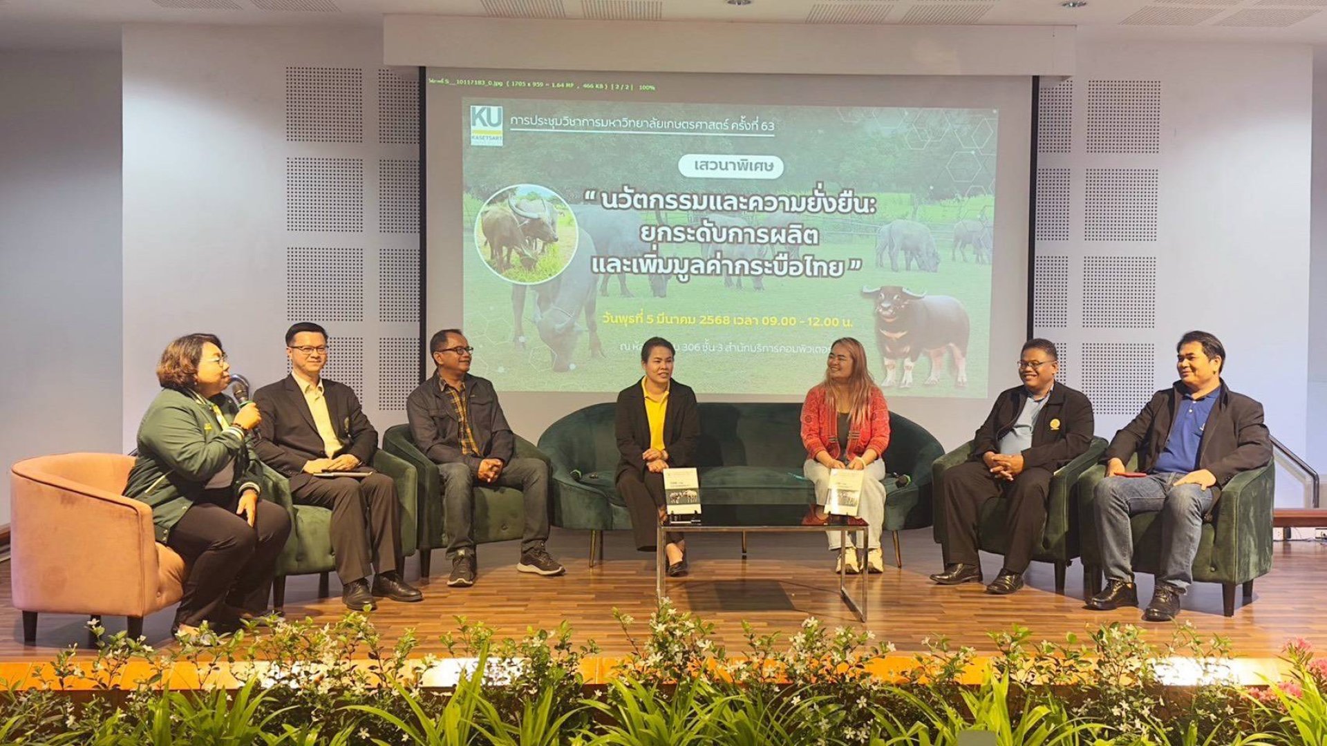 ในโอกาสนี้ ภาควิชาสัตวบาล คณะเกษตร มหาวิทยาลัยเกษตรศาสตร์ ได้จัดการเสวนาพิเศษในหัวข้อ นวัตกรรมและความยั่งยืน : ยกระดับการผลิตและเพิ่มมูลค่ากระบือไทย โดยมี รศ.ดร.ศกร คุณวุฒิฤทธิรณ จากหน่วยวิจัยเฉพาะทางพันธุศาสตร์สัตว์เขตร้อนชื้น ภาควิชาสัตวบาล คณะเกษตร มหาวิทยาลัยเกษตรศาสตร์ นายสุพชัย ปัญญาเอก ผู้จัดการโครงการฟาร์มกระบือทันสมัย มูลนิธิเจริญโภคภัณฑ์ นางจิราภัค ขำเอนก ประธานเครือข่ายผู้เลี้ยงกระบือจังหวัดบุรีรัมย์ และเจ้าของรวินันท์ฟาร์ม สพ.ญ.ธาราทิพย์ พุ่มระชัฎร์ จากโครงการอนุรักษ์และพัฒนากระบือไทย นายนิรุจน์ พันธ์ศรี จากสำนักงานปศุสัตว์จังหวัดบุรีรัมย์ กรมปศุสัตว์ รวมทั้ง นายสานน กันรัมย์ ผู้จัดการบริษัท สไมล์ บีฟ จำกัด ร่วมเป็นวิทยากรบนเวทีเสวนา ซึ่งดำเนินรายการโดย นางธัญวรรณ ศรีวาจนะ จากสถานีวิทยุ มหาวิทยาลัยเกษตรศาสตร์ โดยมีการจัดขึ้นที่ ห้องประชุม 306 ชั้น 3 สำนักบริการคอมพิวเตอร์ มหาวิทยาลัยเกษตรศาสตร์