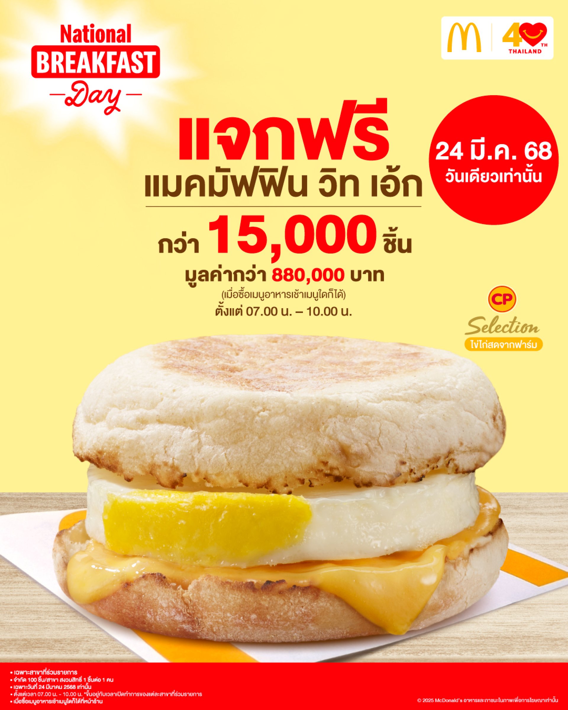 "แมคโดนัลด์" ชวนเริ่มต้นเช้าที่สดใส ด้วยอาหารเช้าแสนอร่อย พร้อมฉลองวันอาหารเช้าแห่งชาติ National Breakfast Day ด้วยความพิเศษ แจกฟรี! แมคมัฟฟิน วิท เอ้ก เมนูอาหารเช้ายอดนิยมจากแมคโดนัลด์ "แมคมัฟฟิน วิท เอ้ก" อร่อยกับขนมปังแบบอิงลิช มัฟฟิน เหนียวนุ่ม พร้อมไข่ดาวทอดสดใหม่ กลมกล่อมกับชีสนิวซีแลนด์เข้มข้น จำนวนกว่า 15,000 ชิ้น (มูลค่ารวมกว่า 880,000 บาท) เมื่อซื้อเมนูอาหารเช้าเมนูใดก็ได้ผ่านช่องทางการสั่งซื้อที่หน้าเคาท์เตอร์และแมคไดรฟ์ทรู (จำกัด 100 ชิ้น/สาขา และ สงวนสิทธิ์ 1 ชิ้น ต่อ 1 คนเท่านั้น)