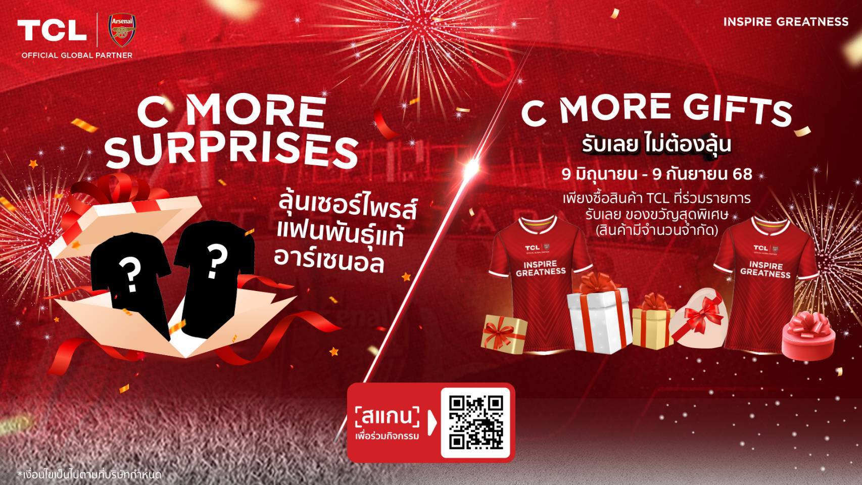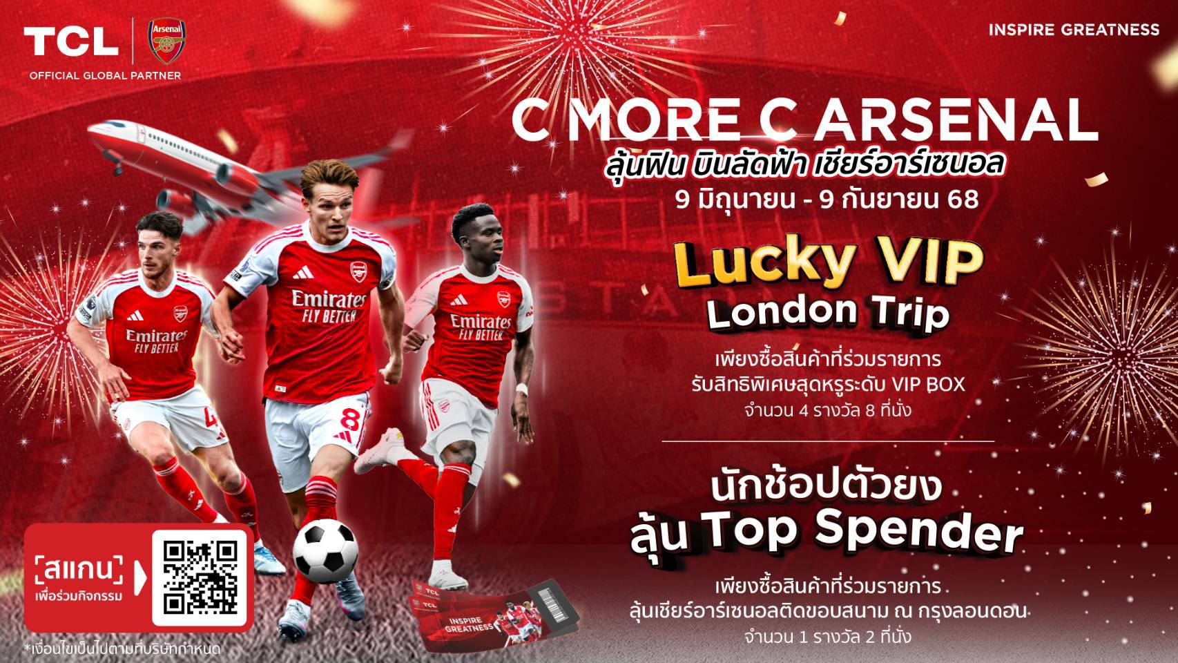 ขณะเดียวกัน TCL เดินหน้าสร้างการมีส่วนร่วมกับผู้บริโภคสัมผัสความล้ำสมัยของเทคโนโลยีอย่างใกล้ชิด ในกิจกรรมแคมเปญ C MORE C ARSENAL ที่ผสานพลังของกีฬาและนวัตกรรม โดยร่วมมือกับสโมสรฟุตบอลอาร์เซนอลพันธมิตรระดับโลก มอบสิทธิประโยชน์แก่แฟนบอลและผู้บริโภคในประเทศไทย เชิญชวนร่วมกิจกรรมสุดมันส์ ทั้งเกม การแสดงเทคโนโลยี Interactive AI และสุดเอ็กซ์คลูซีฟกับการร่วมแชร์มุมมองประสบการณ์การใช้งานจริง จากแบรนด์พรีเซนเตอร์ "ป้อง ณวัฒน์ กุลรัตนรักษ์" ที่จะร่วมสร้างความประทับใจ มอบประสบการณ์ที่มีคุณค่า พร้อมร่วมลุ้นฟินบินลัดฟ้า เชียร์อาเซนอลติดขอบสนามกรุงลอนดอนประเทศอังกฤษ และรับของรางวัลมูลค่ารวมกว่า 5,000,000 บาท