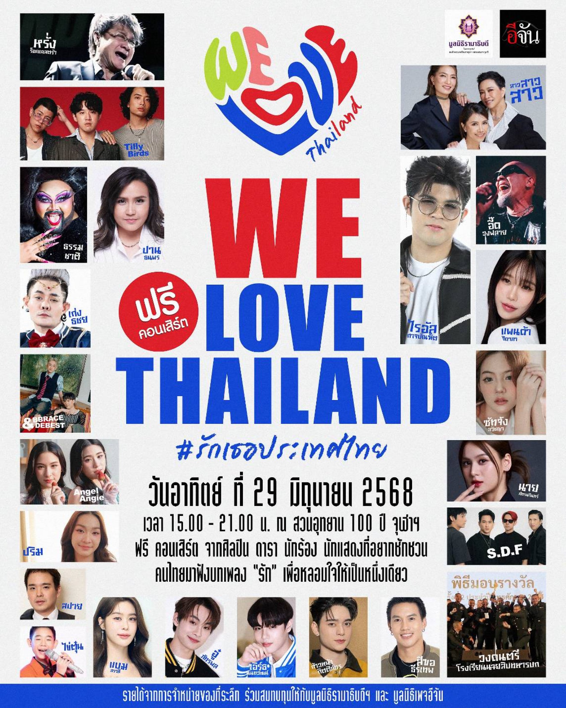29 มิ.ย.นี้ ร่วมแสดงพลังความรักประเทศไทย ส่งต่อพลังงานบวกให้แก่กัน ในงาน "WE LOVE THAILAND #รักเธอประเทศไทย" พบกับฟรีคอนเสิร์ตแห่งความรักและพลังบวกเพื่อหัวใจคนไทยทุกคน ณ อุทยาน 100 ปี จุฬาฯ ตั้งแต่เวลา 15.00 21.00 น.