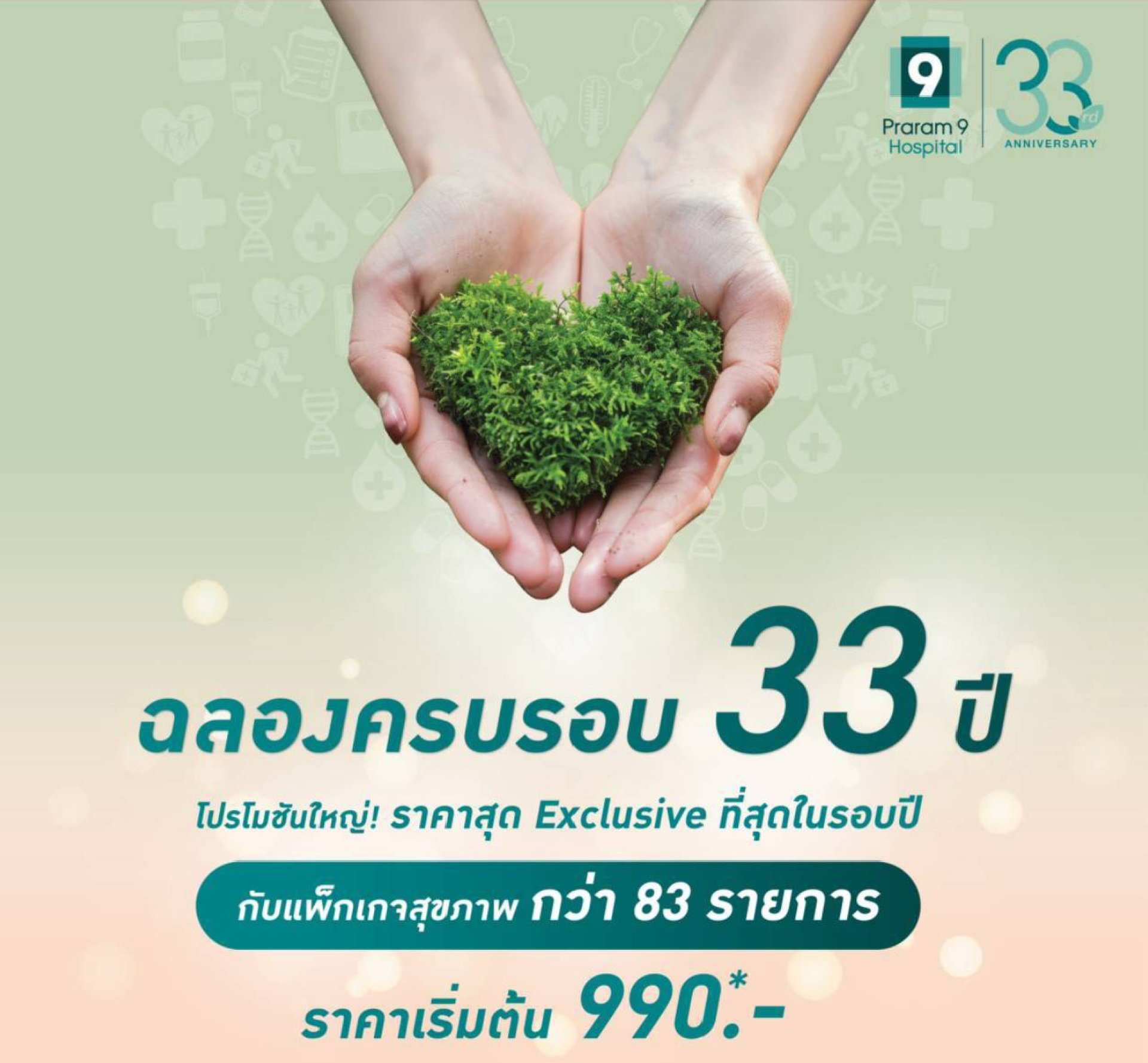 ในโอกาสครบรอบ 33 ปี โรงพยาบาลพระรามเก้า ขอขอบคุณทุกความไว้วางใจจากผู้ใช้บริการ ด้วยการจัดแคมเปญสุขภาพครั้งยิ่งใหญ่แห่งปี Good Health Grows With Care สุขภาพที่ดีเริ่มต้นจากการดูแลอย่างใส่ใจ เพื่อส่งต่อของขวัญแห่งสุขภาพดีให้แก่ทุกคนที่คุณรัก ผ่านโปรแกรมตรวจสุขภาพสุดคุ้มกว่า 83 รายการ ที่ครอบคลุมทุกช่วงวัย ทุกไลฟ์สไตล์ และทุกความกังวลด้านสุขภาพ พร้อมรับส่วนลดสูงสุดถึง 50%