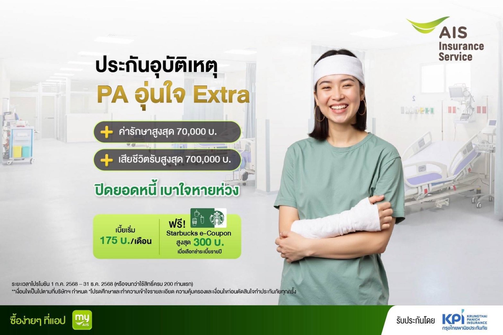 แผนประกันอุบัติเหตุ "PA อุ่นใจ Extra" พร้อมมอบความอุ่นใจแบบ Extra ด้วยเบี้ยเริ่มต้นเพียง 175 บาท ลูกค้าที่สนใจสามารถคลิกซื้อได้ที่ แอปพลิเคชัน myAIS ตั้งแต่วันที่ 1 กรกฎาคม ถึง 31 ธันวาคม 2568 เป็นต้นไป
