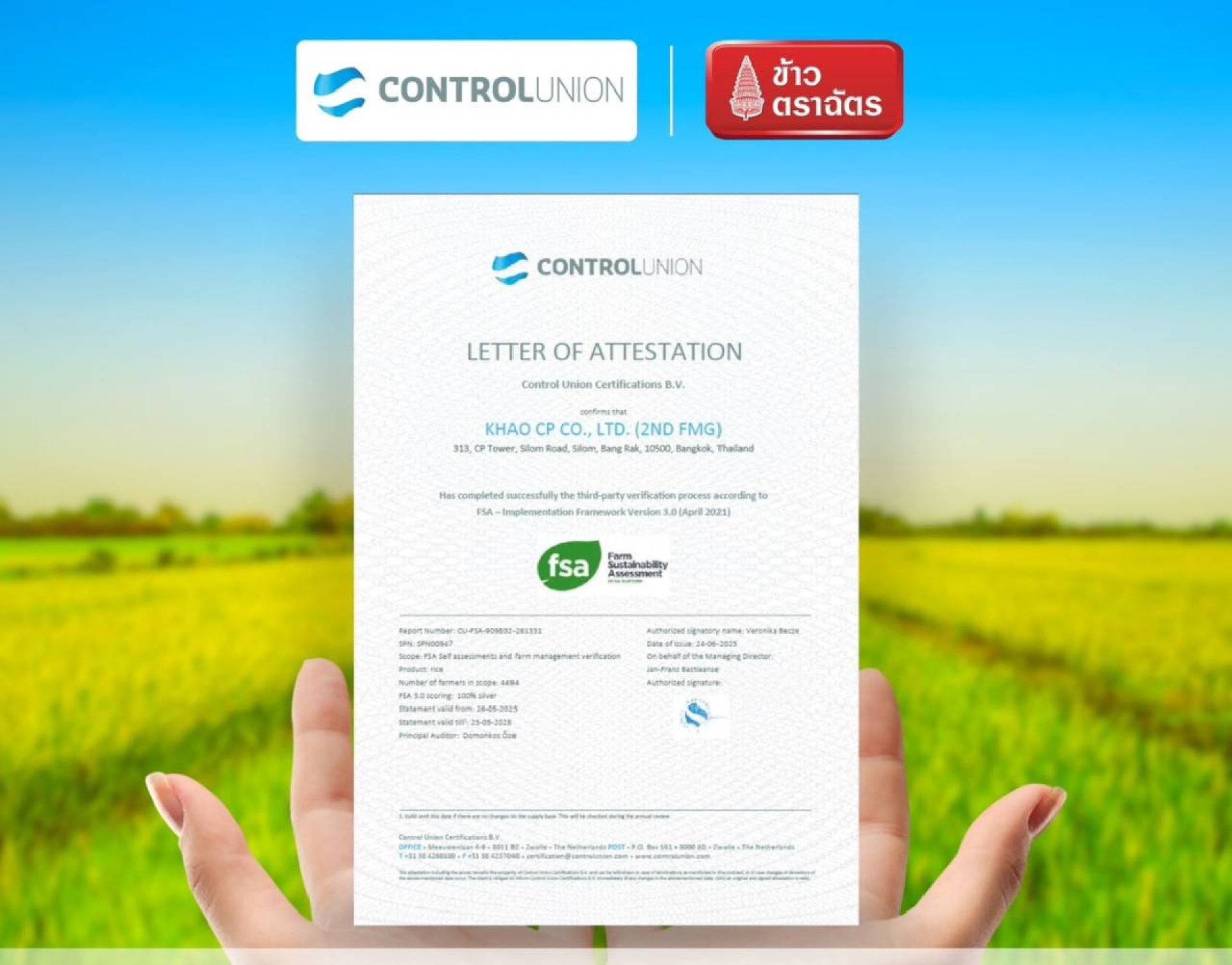 บริษัท ข้าว ซี.พี. จำกัด ผู้ผลิต ข้าวตราฉัตร เดินหน้ายกระดับมาตรฐานการผลิตข้าวไทยอย่างยั่งยืน ผ่านการรับรองมาตรฐาน Farm Sustainability Assessment (FSA) Version 3.0 ระดับ Silver จากบริษัท คอนโทรล ยูเนียน (ประเทศไทย) จำกัด หนึ่งในองค์กรตรวจประเมินชั้นนำระดับโลก