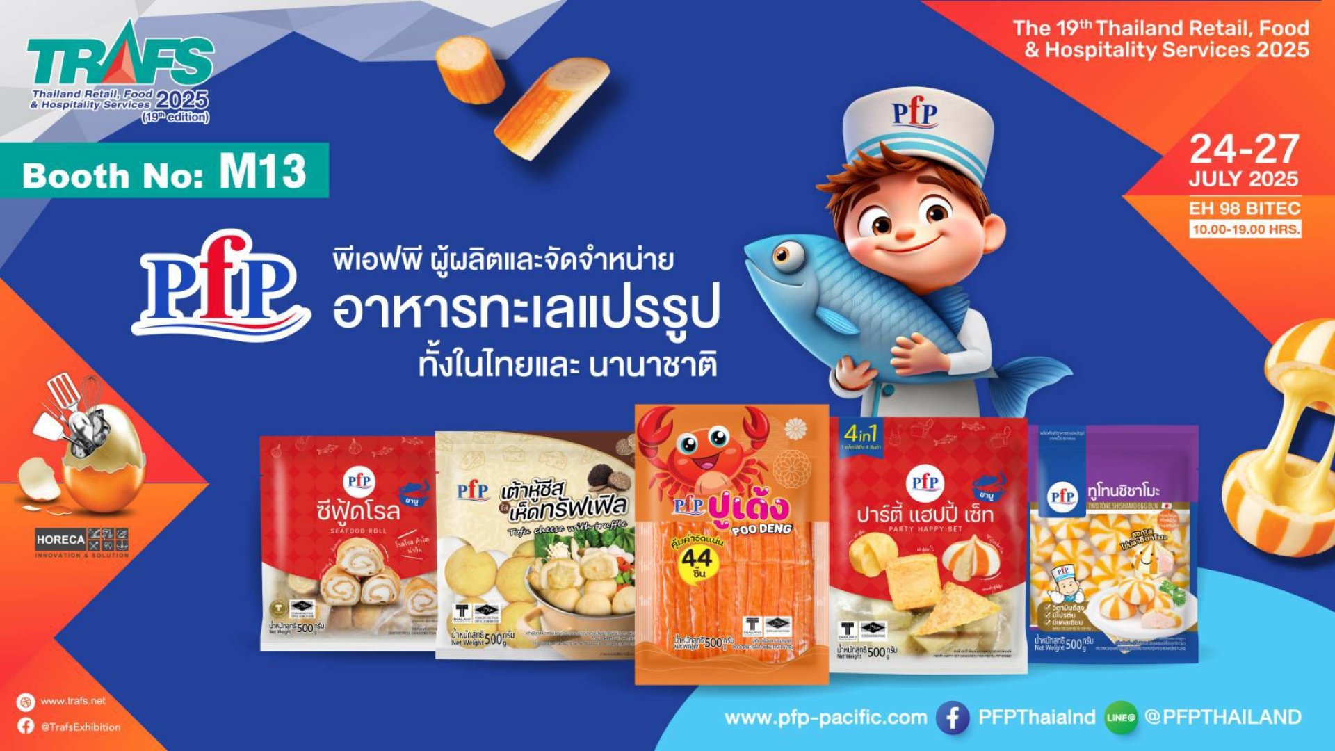 กิจกรรมพิเศษในงาน ได้แก่ การจัดรอบชิมเมนูร้อน ๆ เพื่อให้ผู้เข้าร่วมงานได้ลิ้มลองรสชาติจริง พร้อมรับคำแนะนำจาก ทีมผู้เชี่ยวชาญของ PFP เกี่ยวกับการต่อยอดเมนู และการเลือกผลิตภัณฑ์ที่เหมาะสมสำหรับธุรกิจ HoReCa ในทุกรูปแบบ พบกับ PFP ได้ที่บูธ M13 ในงาน TRAFS 2025 ระหว่างวันที่ 24-27 กรกฎาคม 2568 เวลา 10.00-19.00 น. ณ ฮอลล์ 98 ไบเทค บางนาหรือสอบถามข้อมูลเพิ่มเติมได้ที่ บริษัท พี.เอฟ.พี. เทรดดิ้ง จำกัด โทร 0 2285 4070 -5 หรือเยี่ยมชมเว็บไซต์ www.pfp-pacific.com และ Facebook Fanpage: PFP Thailand