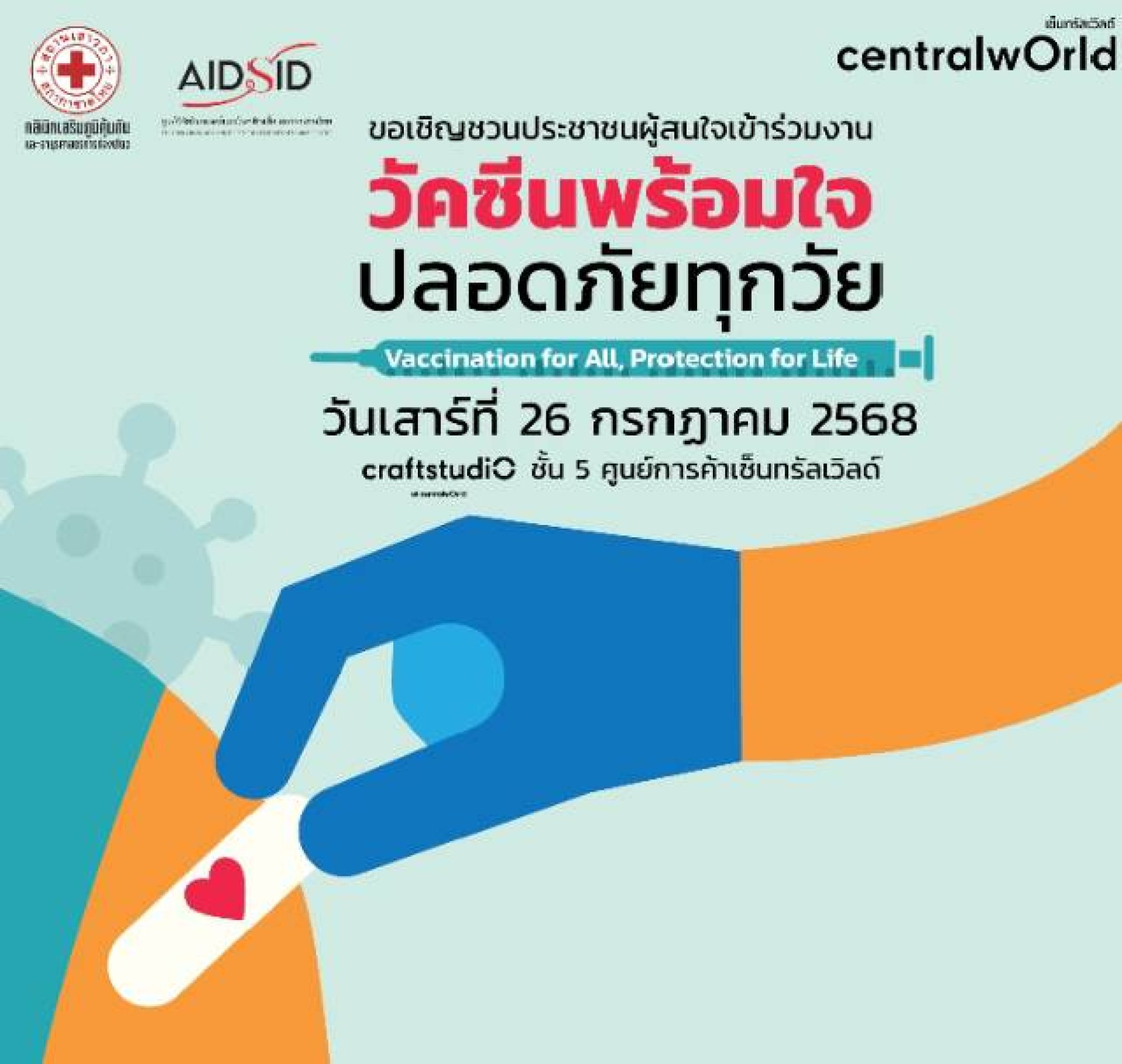 สถานเสาวภา ร่วมกับศูนย์วิจัยโรคเอดส์และโรคติดเชื้อ สภากาชาดไทย ขอเชิญประชาชนทั่วไปเข้าร่วม กิจกรรม "วัคซีนพร้อมใจ ปลอดภัยทุกวัย Vaccination for All, Protection for Life" ซึ่งเป็นโครงการรณรงค์ การให้ความรู้เรื่องโรคและการป้องกันด้วยวัคซีนในผู้ใหญ่และผู้สูงอายุ เพื่อสร้างความตระหนักรู้เกี่ยวกับโรคที่ สามารถป้องกันได้ด้วยวัคซีนในกลุ่มผู้ใหญ่และผู้สูงอายุ ซึ่งจะจัดขึ้นในวันเสาร์ที่ 26 กรกฎาคม 2568 เวลา 12.00 - 19.00 น. ณ craftstudiO ชั้น 5 เซ็นทรัลเวิลด์