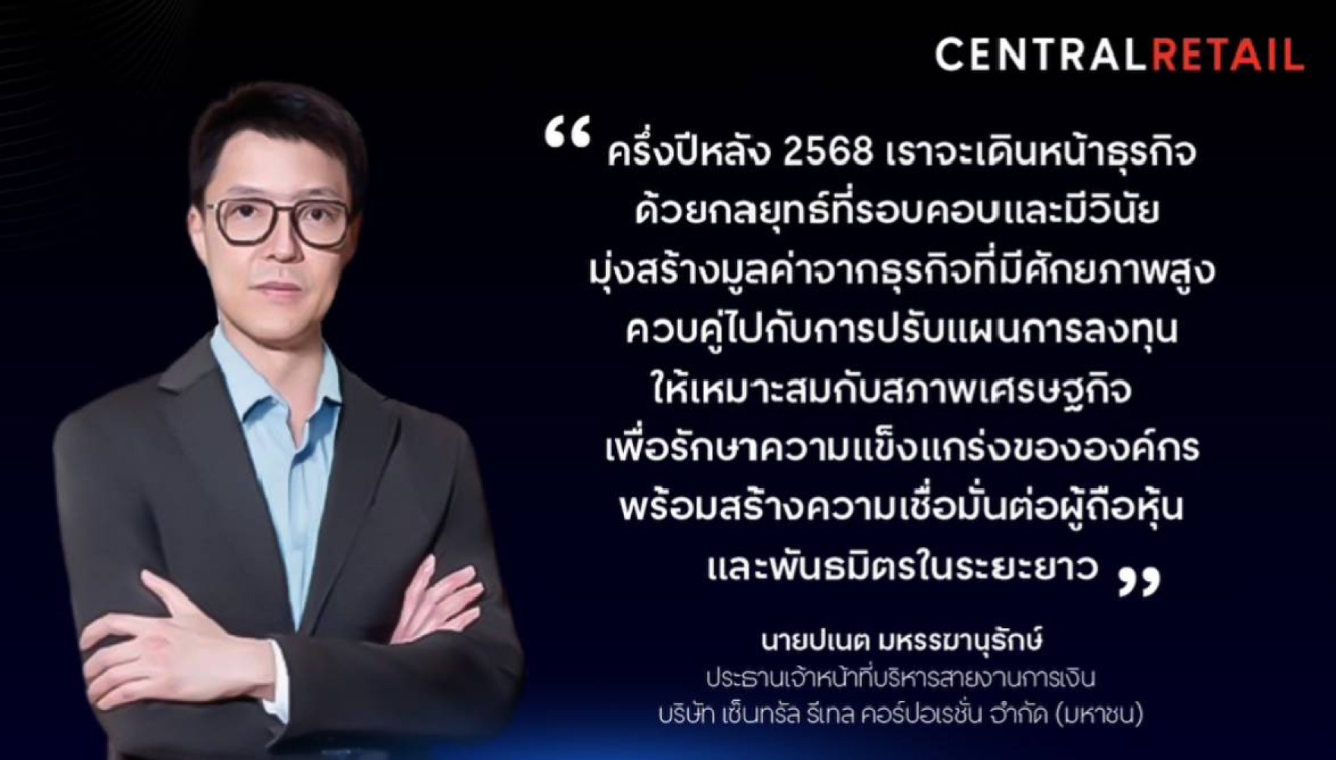 "สำหรับครึ่งปีหลัง 2568 เซ็นทรัล รีเทล จะเดินหน้าธุรกิจด้วยความรอบคอบและมีวินัยทางการเงิน มุ่งเพิ่มประสิทธิภาพการดำเนินงานในกลุ่มธุรกิจหลัก ควบคู่กับการปรับลำดับความสำคัญของการลงทุนให้สอดคล้องกับสภาวะเศรษฐกิจและโอกาสทางการตลาด เพื่อเสริมความแข็งแกร่งของสถานะทางการเงิน และขับเคลื่อนการเติบโตอย่างมั่นคงและยั่งยืน ตอกย้ำความเชื่อมั่นด้วยการได้รับการจัดอันดับความน่าเชื่อถือระดับ AA- แนวโน้มคงที่ ต่อเนื่อง 3 ปีซ้อนจากบริษัท ทริสเรทติ้ง จำกัด ซึ่งถือเป็นอันดับสูงสุดในกลุ่มอุตสาหกรรมค้าปลีกไทย สร้างความมั่นใจให้แก่นักลงทุนและพันธมิตรทางธุรกิจ" นายปเนต กล่าวทิ้งท้าย
