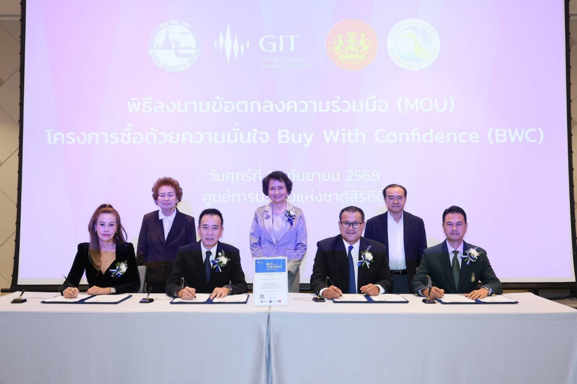 "กระทรวงพาณิชย์" โดยสถาบันวิจัยและพัฒนาอัญมณีและเครื่องประดับแห่งชาติ (องค์การมหาชน) หรือ GIT ร่วมกับการท่องเที่ยวแห่งประเทศไทย (ททท.) กรมการท่องเที่ยว และสำนักงานคณะกรรมการคุ้มครองผู้บริโภค (สคบ.) จัดพิธีลงนามบันทึกข้อตกลงความร่วมมือ (MOU) ภายใต้โครงการ "ซื้อด้วยความมั่นใจ" (Buy with Confidence: BWC) วันพฤหัสบดีที่ 12 กันยายน 2568 เวลา 13.30 - 15.00 น. ณ ห้องประชุม 110C ชั้น 1 ศูนย์การประชุมแห่งชาติสิริกิติ์ โดยได้รับเกียรติจากนายนันทวัลย์ ศกุนตนาค ประธานกรรมการ GIT เป็นสักขีพยานรวมถึงกล่าวแสดงความยินดี และนายสุเมธ ประสงค์พงษ์ชัย ผู้อำนวยการ GIT กล่าวถึงวัตถุประสงค์ของการจัดงาน