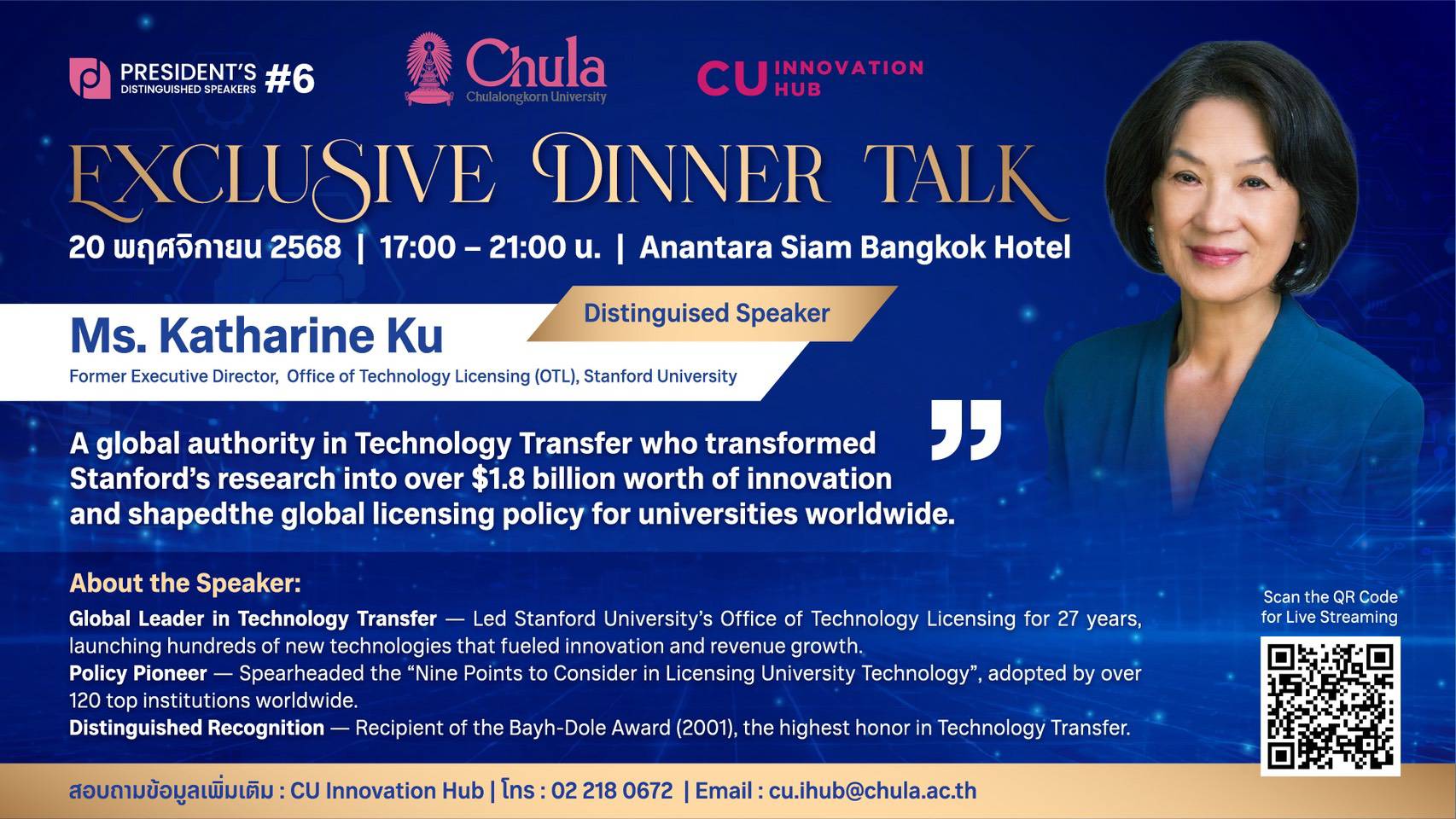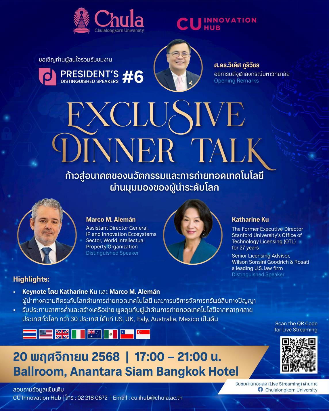 งาน President's Distinguished Speaker #6 จะจัดขึ้นในวันพฤหัสบดีที่ 20 พฤศจิกายน 2568 เวลา 17.00 - 21.00 น. ณ โรงแรมอนันตรา สยาม กรุงเทพฯ และเปิดให้ผู้สนใจเข้าร่วมรับชมผ่านการถ่ายทอดสด (Live Streaming) ทาง Facebook Page: Chulalongkorn University