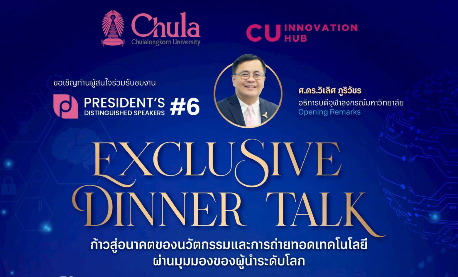 จุฬาลงกรณ์มหาวิทยาลัย ขอเชิญชวนบุคคลทั่วไป ผู้สนใจด้านนวัตกรรม และบุคลากรในระบบนิเวศธุรกิจนวัตกรรม เข้าร่วมรับชมการถ่ายทอดสด (Live Streaming) งาน President's Distinguished Speaker ครั้งที่ 6 เพื่อเปิดมุมมองและรับฟังแนวคิดจากสองผู้นำระดับโลกด้านนวัตกรรม และทรัพย์สินทางปัญญาที่จะมาร่วมแบ่งปันประสบการณ์การพัฒนาระบบนิเวศนวัตกรรมและการจัดการทรัพย์สินทางปัญญาในระดับสากล