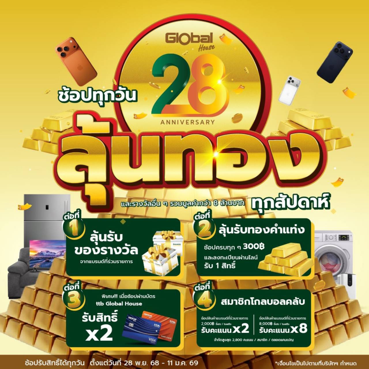 โกลบอลเฮ้าส์ขอเชิญชวนลูกค้าสมาชิกโกลบอลคลับทุกท่าน ร่วมเป็นส่วนหนึ่งในแคมเปญ 28 ปี "โกลบอลเฮ้าส์ ช้อปทุกวัน ลุ้นทอง ทุกสัปดาห์"" และรางวัลอื่นๆ รวมมูลค่ากว่า 8 ล้านบาท เพื่อแสดงความขอบคุณลูกค้าทุกท่านที่ให้การสนับสนุนและไว้วางใจเรามาโดยตลอดระยะเวลาที่ผ่านมา