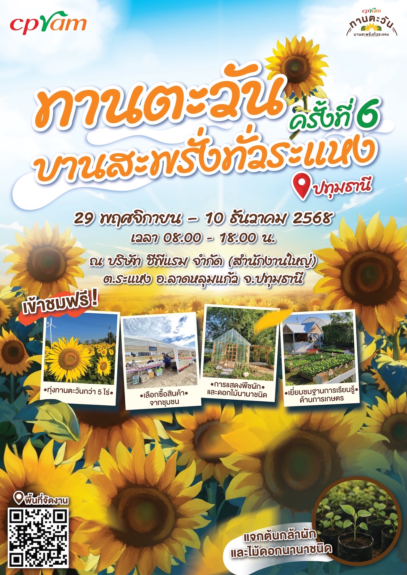 บริษัท ซีพีแรม จำกัด (CPRAM) ผู้นำด้านอุตสาหกรรมอาหารพร้อมรับประทาน เชิญชวนทุกคนมาเติมความสุขรับลมหนาว ท่ามกลางความงดงามของทุ่งดอกทานตะวันบานสะพรั่งกว่า 5 ไร่ ในงาน "ทานตะวันบานสะพรั่งทั่วระแหงครั้งที่ 6" จัดขึ้นระหว่างวันที่ 29 พฤศจิกายน - 10 ธันวาคม 2568 ณ สำนักงานใหญ่ บริษัท ซีพีแรม จำกัด จังหวัดปทุมธานี ซึ่งอยู่ใกล้กรุงเทพฯ เพียง 45 นาที! งานนี้ เข้าชมฟรีทุกวัน!
