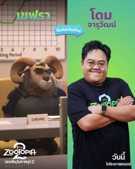 โดม จารุวัฒน์ ให้เสียงไทยเป็น เชฟรา (Chevre) แพะตัวผู้สุดดุดันที่ทำงานให้กับ กรมตำรวจซูโทเปีย ร่วมกับคู่หู เจ้าหน้าที่บูเชอรอน (Bûcheron)