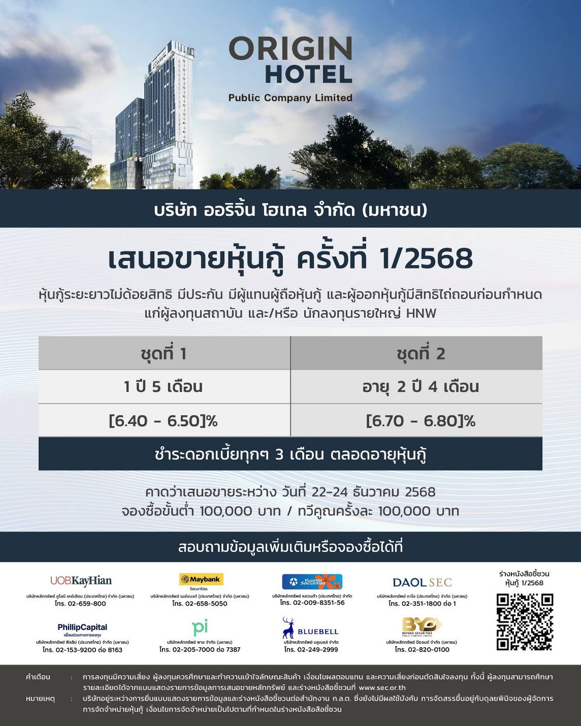"ออริจิ้น โฮเทล" ยื่นไฟลิ่งเตรียมเสนอขายหุ้นกู้ครั้งที่ 1/2568 จ่ายดอกเบี้ยทุก 3 เดือน ตลอดอายุหุ้นกู้ อัตราดอกเบี้ย [6.40-6.80]% ต่อปี เตรียมเปิดจองวันที่ 22-24 ธันวาคม 2568 ผ่านบริษัทหลักทรัพย์สถาบันการเงินทั้ง 8 แห่ง