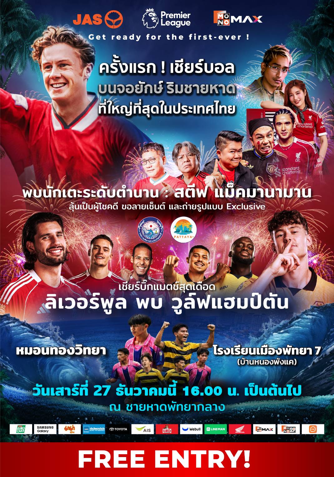 บริษัท จัสมิน อินเตอร์เนชั่นแนล จำกัด (มหาชน) หรือ JAS ผู้ถือลิขสิทธิ์หลักฟุตบอลพรีเมียร์ลีกและเอมิเรตส์เอฟเอคัพอย่างเป็นทางการแต่เพียงผู้เดียว ร่วมกับ Monomax แพลตฟอร์มหลักในการถ่ายทอดสดฟุตบอลพรีเมียร์ลีกและเอมิเรตส์เอฟเอคัพตลอด 6 ฤดูกาล จัดงาน "Monomax : Watch Party on the Beach" กับการรับชมฟุตบอลพรีเมียร์ลีกคู่ระหว่าง "ลิเวอร์พูล" พบ "วูล์ฟแฮมป์ตัน" บนจอยักษ์ริมทะเลขนาดใหญ่ที่สุดเป็นครั้งแรกในประเทศไทย ในวันเสาร์ที่ 27 ธันวาคม 2568 ตั้งแต่เวลา 16.00 น. เป็นต้นไป ณ ชายหาดพัทยากลาง เพื่อยกระดับการใช้ประโยชน์จากลิขสิทธิ์เชิงพาณิชย์ พร้อมสร้างกิจกรรมทางเศรษฐกิจและกระตุ้นการท่องเที่ยวในพื้นที่พัทยาช่วงปลายปี