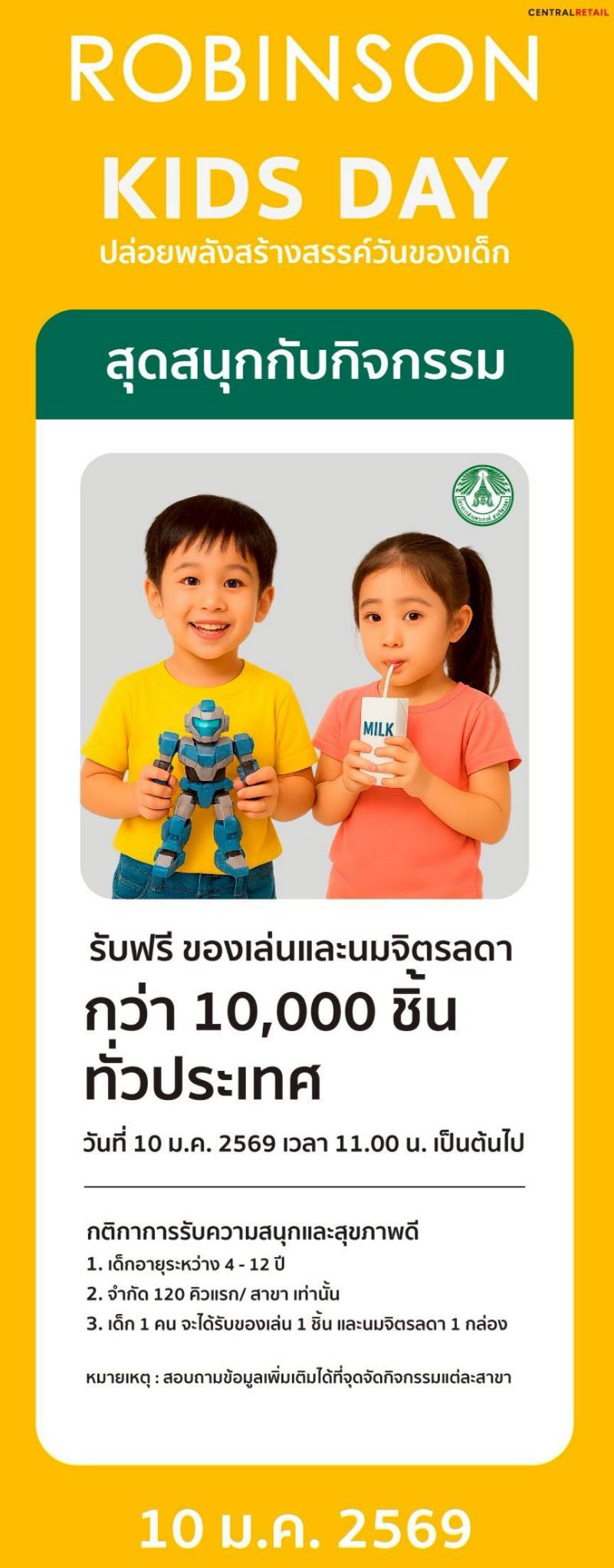 ต้อนรับวันเด็กแห่งชาติ ด้วยการแจกของเล่นและนมจิตรลดากว่า 10,000 ชิ้น เพื่อเติมพลัง รอยยิ้ม สร้างสุขภาพที่ดีและความสุขให้กับน้อง ๆ ในวันพิเศษ ซึ่งจัดขึ้นตั้งแต่เวลา 11.00 น. ในวันที่ 10 ม.ค. 69 ที่ห้างโรบินสัน 43 สาขาทั่วประเทศ ได้แก่ รังสิต, ราชพฤกษ์, สุขุมวิท, ศรีสมาน, มหาชัย, ลาดกระบัง, สมุทรปราการ, เชียงใหม่, พิษณุโลก, อยุธยา 1 (อยุธยา ซิตี้พาร์ค), อยุธยา 2 (เซ็นทรัล อยุธยา), ลำปาง, แม่สอด, ลพบุรี, กำแพงเพชร, จันทบุรี, ศรีราชา, สุพรรณบุรี, ฉะเชิงเทรา, ระยอง, กาญจนบุรี, ชลบุรี 1, ปราจีนบุรี, ชลบุรี 2, บ่อวิน, บ้านฉาง, อุบลราชธานี, สระบุรี, ร้อยเอ็ด, บุรีรัมย์, สกลนคร, สุรินทร์, มุกดาหาร, ชัยภูมิ, สุราษฎร์ธานี, ตรัง, จังซีลอน, หาดใหญ่, ถลาง, ฉลอง, นครศรีธรรมราช 2, ราชบุรี, เพชรบุรี และเชียงราย