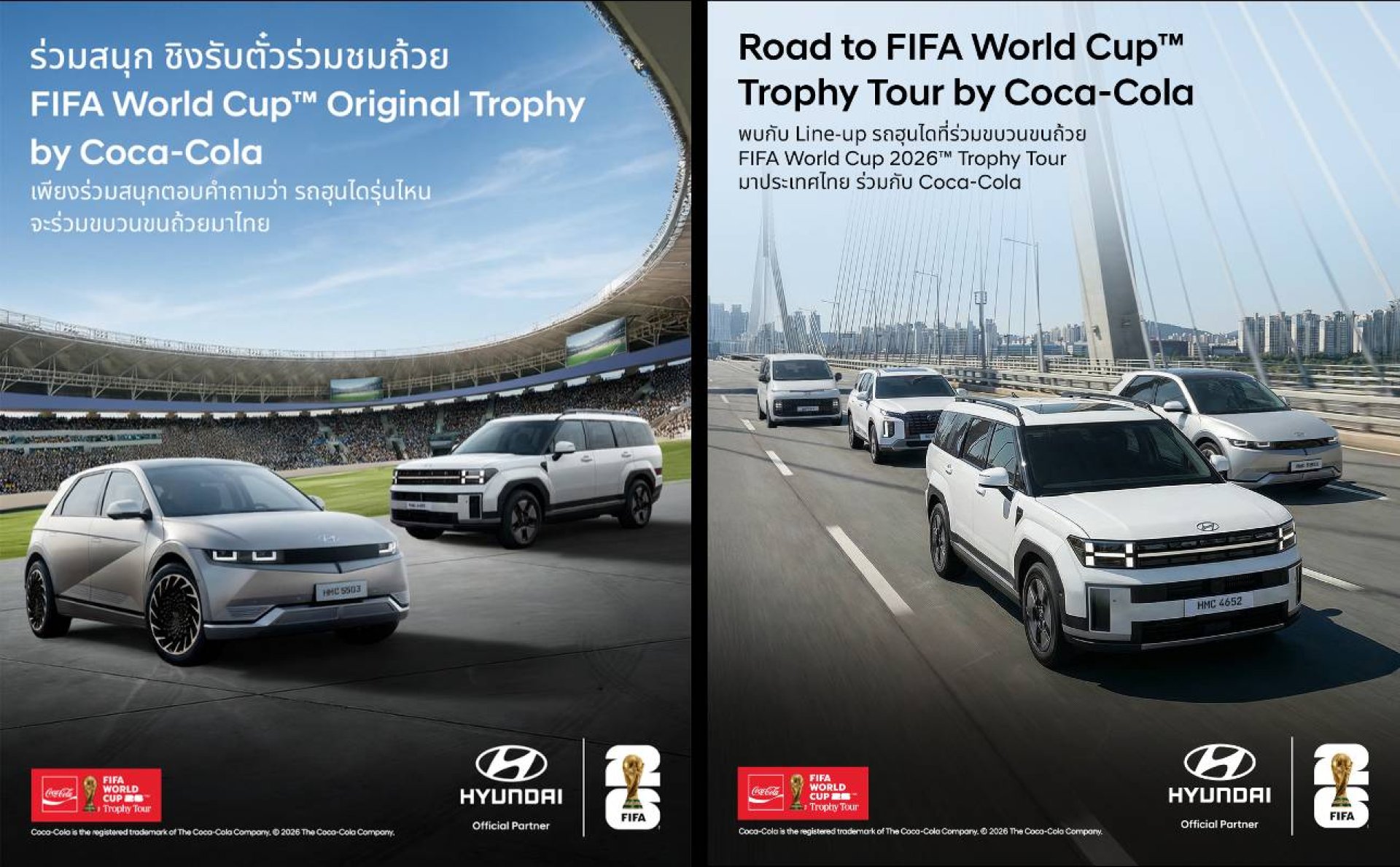 กระแสฟุตบอลโลกเริ่มอุ่นเครื่องก่อนศึกใหญ่จะเปิดฉากอย่างเป็นทางการ เมื่อ "ฮุนได" จับมือกับ “โคคา-โคล่า” จุดประกายความคลั่งไคล้ลูกหนังในประเทศไทย ผ่านกิจกรรมระดับโลก "FIFA World Cup 2026™ Trophy Tour by Coca-Cola" นำถ้วยแห่งประวัติศาสตร์อันทรงคุณค่าและยิ่งใหญ่ที่สุดในวงการฟุตบอลอย่าง FIFA World Cup™ Trophy เดินทางมาให้แฟนบอลชาวไทยได้สัมผัสของจริงแบบใกล้ชิด ก่อนศึก FIFA World Cup 2026™ จะระเบิดความมันทั่วโลก