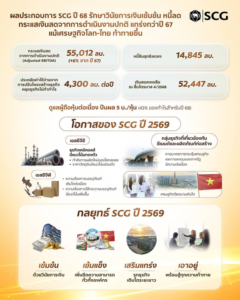ผลประกอบการเอสซีจีปี 68 รักษาวินัยการเงินเข้มข้น กระแสเงินสดจากการดำเนินงานปกติ ที่ไม่รวมรายการพิเศษ (Adjusted EBITDA) 55,012 ล้านบาท แข็งแกร่งกว่าปี 67 คิดเป็น 6% ขณะที่หนี้ลดลง 14,845 ล้านบาทจากปีก่อน แม้เศรษฐกิจโลกและไทยท้าทายขึ้น ชี้ผลการปรับโครงสร้างธุรกิจ หยุดธุรกิจไม่ทำกำไร และประหยัดค่าใช้จ่าย ได้รวมกว่า 4,300 ล้านบาทต่อปี พร้อมเคาะปันผล 5.0 บาท/หุ้น ดูแลผู้ถือหุ้นต่อเนื่อง ปี 2569 ธุรกิจเคมิคอลส์มีแนวโน้มทรงตัว เนื่องจากกำลังการผลิตใหม่ของโลกลดลง และราคาวัตถุดิบมีแนวโน้มอ่อนตัว เอสซีจีจึงเดินหน้าเข้มข้น ด้วยวินัยการเงิน – เข้มแข็ง เพิ่มขีดความสามารถทั่วองค์กร – เสริมแกร่ง รุกธุรกิจเติบโตระยะยาว มุ่งกลยุทธ์ Regional Optimization ชูเวียดนาม เป็นฐานผลิตรับตลาดในประเทศและส่งออกตลาดโลก พร้อมดันสินค้า SVP - HVA และ Green ที่แนวโน้มเติบโตสูง – เอาอยู่ พร้อมสู้ทุกความท้าทาย