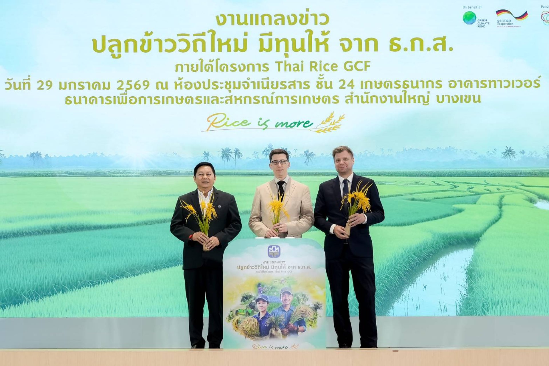 ธ.ก.ส. ร่วม GIZ เปิดตัวเงินอุดหนุนและสินเชื่อดอกเบี้ยต่ำ ภายใต้โครงการ Thai Rice GCF วงเงินกว่า 5,300 ล้านบาท สนับสนุนเกษตรกรผู้ปลูกข้าวไทย 40,000 ราย เพื่อปรับเปลี่ยนวิถีการปลูกข้าวที่เท่าทันต่อสภาพภูมิอากาศ ลดปัญหาโลกร้อน