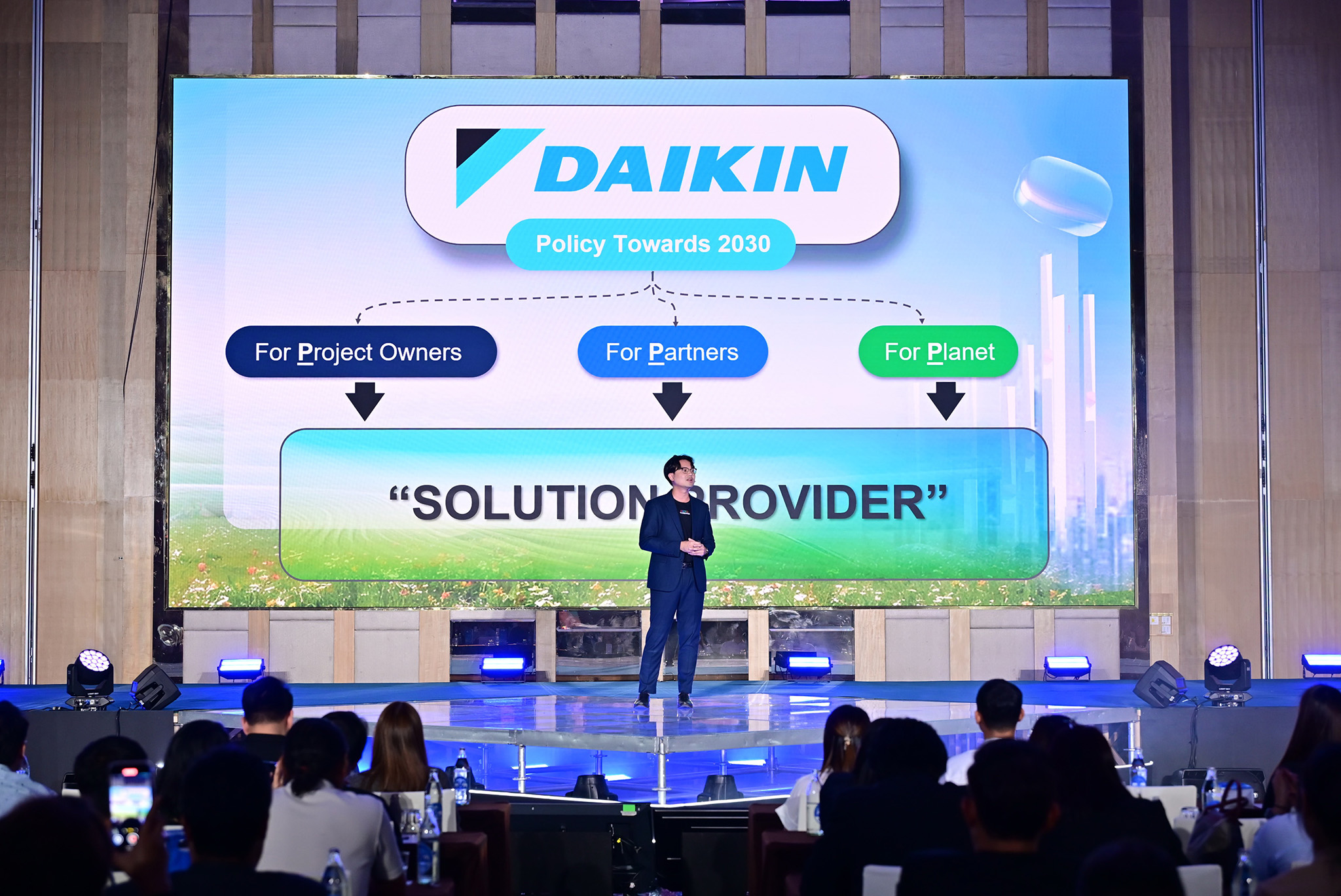 นายทาคาโยชิ ระบุว่า ไดกิ้นมีความพร้อมเฉพาะตัวในการนำเสนอ Total Solutions นี้ให้ครอบคลุมตั้งแต่เครื่องปรับอากาศที่พักอาศัยและเชิงพาณิชย์ รวมถึงระบบขนาดใหญ่ (Applied Products) ตลอดจนการผลิตและจัดการสารทำความเย็น ซึ่งเป็นการออกแบบโซลูชันได้ทั้งระบบ นอกจากนี้ ไดกิ้นยังมุ่งมั่นขยายเครือข่ายเชื่อมโยงและสร้างความสัมพันธ์กับลูกค้า (Customer-Connected Solutions) เพื่อพัฒนาความร่วมมือระยะยาวกับลูกค้าที่มีเป้าหมายร่วมกันในการมุ่งสู่ความเป็นกลางทางคาร์บอน เพื่อร่วมเติบโตและสร้างคุณค่าอย่างยั่งยืนไปด้วยกัน ตลอดจนยกระดับบทบาทขององค์กรสู่ “Solution Provider” อย่างจริงจัง