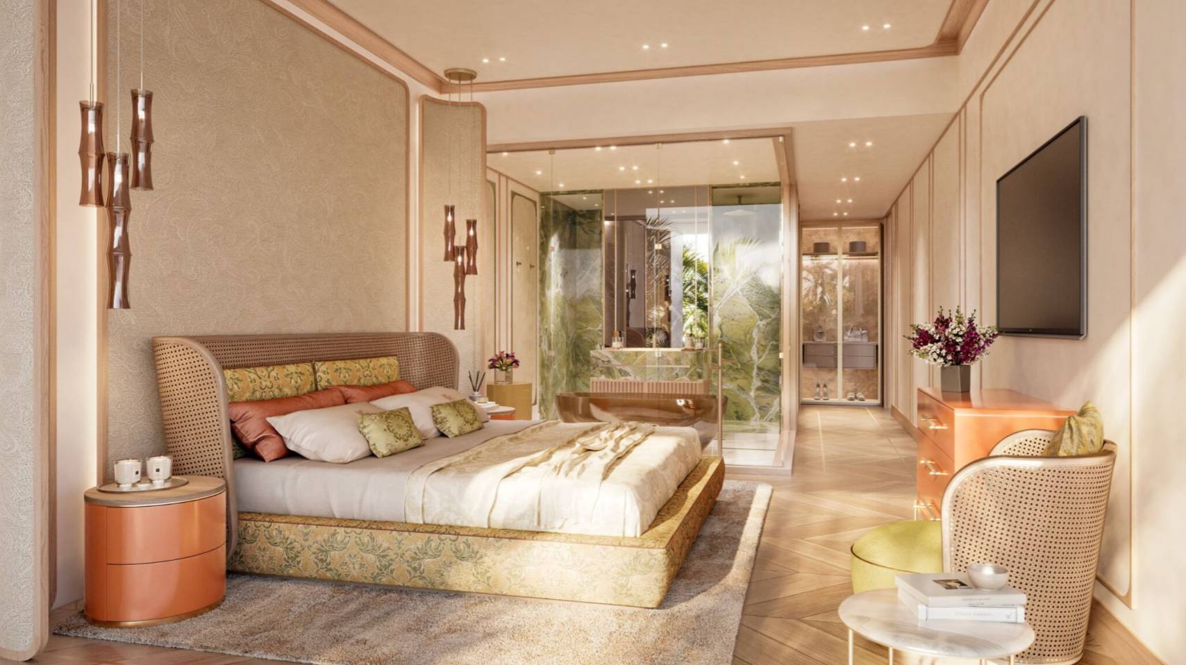 ภาพงานออกแบบภายในที่เปิดเผยล่าสุด ถ่ายทอดการตีความอัตลักษณ์ด้านสีสัน พื้นผิว และลวดลายอันเป็นเอกลักษณ์ของ ETRO ให้กลายเป็นพื้นที่อยู่อาศัยที่เปรียบเสมือนรีทรีตส่วนตัว ซึ่งออกแบบให้กลมกลืนกับธรรมชาติของภูเก็ต การออกแบบนี้ออกแบบโดย The One Atelier เรสซิเดนซ์แต่ละยูนิตถูกรังสรรค์ขึ้นอย่างประณีต ผ่านการจัดวางชั้นเชิงของแสง สัดส่วน และวัสดุอย่างลงตัว สร้างสมดุลอย่างลงตัวระหว่างสุนทรียภาพอันหลากหลายของ ETRO กับบรรยากาศแห่งความสงบและความโปร่งโล่งของพื้นที่