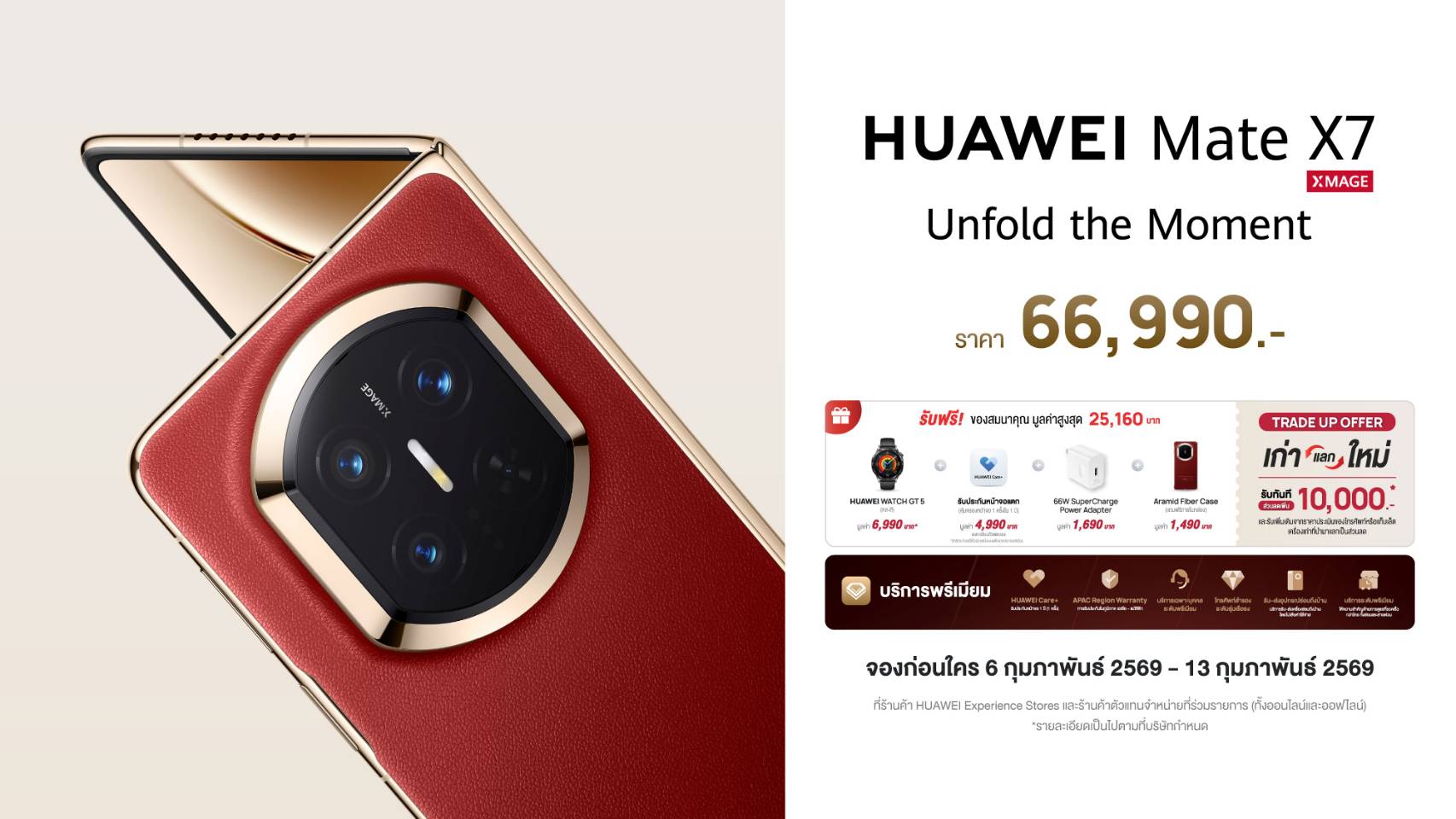 โดย HUAWEI Mate X7 มีให้เลือก 2 สี ได้แก่ สีแดง Nebula Red และสีดำ พร้อมเปิดให้พรีออเดอร์แล้ว ตั้งแต่วันที่ 6 กุมภาพันธ์ 2569 ถึง 13 กุมภาพันธ์ 2569 ในราคาพิเศษ 66,990 บาท พร้อมของสมนาคุณมูลค่าสูงสุด 25,160 บาท อาทิ HUAWEI WATCH GT 5 (คละสี) มูลค่า 6,990 บาท, หัวชาร์จ 66W HUAWEI SuperCharge Power Adapter มูลค่า 1,690 บาท และเคส Aramid Fiber Case แถมฟรีภายในกล่อง มูลค่า 1,490 บาท พร้อมสิทธิ์ Trade Up Offer รับส่วนลดสูงสุด 10,000 บาท เมื่อนำเครื่องเก่ามาแลกซื้อเครื่องใหม่ นอกจากนี้ ยังได้รับสิทธิ์ บริการระดับพรีเมียมจาก HUAWEI อาทิ HUAWEI Care+ รับประกันหน้าจอแตก คุ้มครองหน้าจอ 1 ครั้ง ภายในระยะเวลา 1 ปี มูลค่า 4,990 บาท, การรับประกันในภูมิภาค APAC, บริการโทรศัพท์สำรองรุ่นเรือธง, บริการรับ-ส่งอุปกรณ์ซ่อมถึงบ้านโดยไม่มีค่าใช้จ่าย รวมถึงบริการหลังการขายสุดเอ็กซ์คลูซีฟ และสิทธิพิเศษอื่น ๆ เพื่อยกระดับประสบการณ์การใช้งานให้มั่นใจยิ่งขึ้นตลอดการใช้งาน สิทธิพิเศษดังกล่าว เฉพาะสำหรับการสั่งจองล่วงหน้า ผ่านหน้าร้าน HUAWEI Experience Store และร้านค้าตัวแทนจำหน่ายที่ร่วมรายการ และช่องทางออนไลน์ทั้ง HUAWEI Store, Lazada, Shopee และ TikTok Shop
