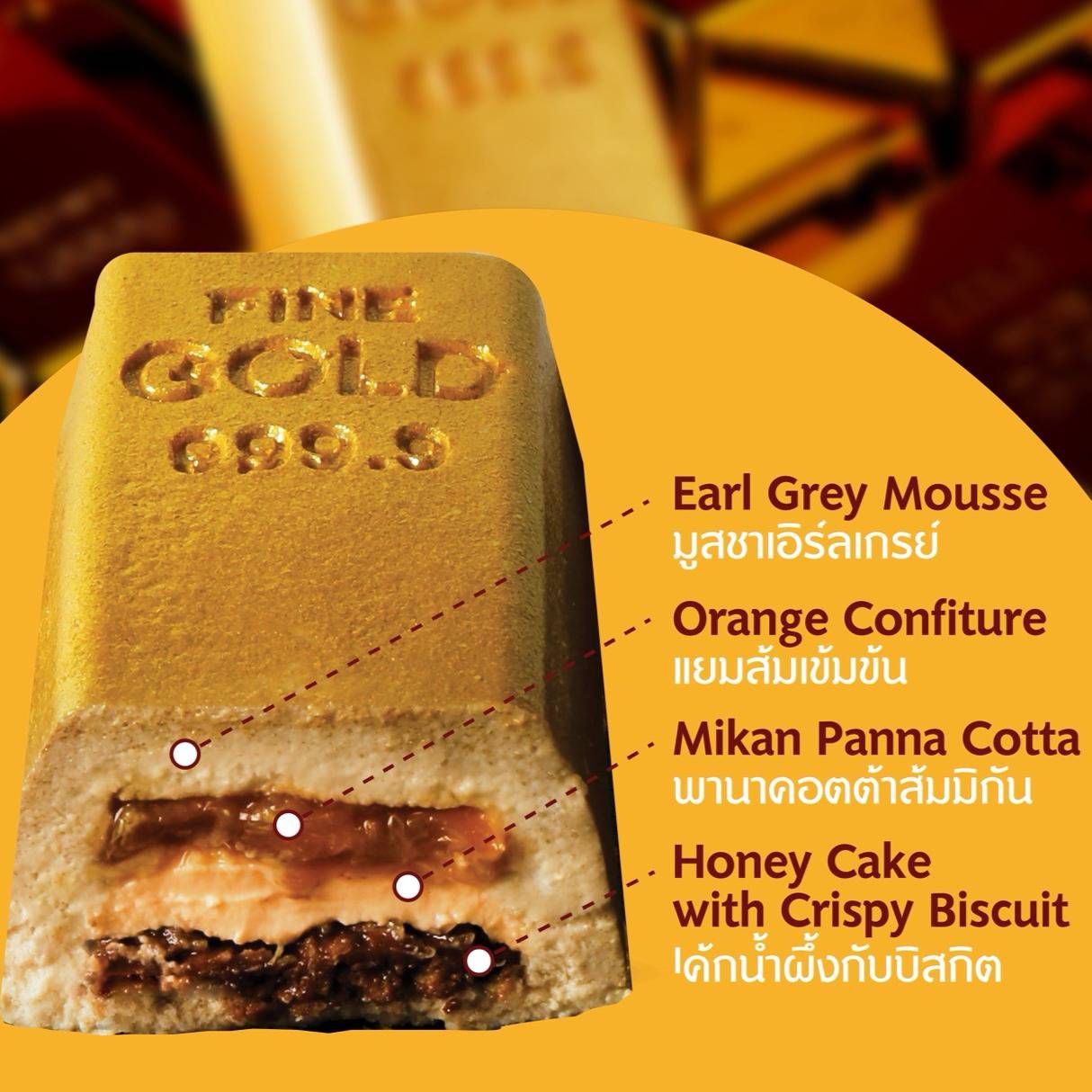 NEW! 2 เมนูทองคำ ไฮไลท์ของเมนูมงคลในปีนี้ คือการหยิบแรงบันดาลใจจาก “ทองคำ” ซึ่งในความเชื่อสื่อถึงความมั่งคั่งร่ำรวย ความอุดมสมบูรณ์ และความมั่งมีศรีสุข มาใช้เป็นแนวคิดในการรังสรรค์เมนูพิเศษ เริ่มที่ Gold Bar Cake เค้ก “ทองคำแท่ง” สื่อความหมายของเงินทองไหลมาเทมา มีกินมีใช้ ซ่อนความอร่อยไว้ถึง 4 เลเยอร์ รสส้ม ‘มิกัน’ และกลิ่นชา Earl Grey หอมนวล เหมาะทั้งสำหรับไหว้เจ้าและมอบเป็นของขวัญในช่วงเทศกาลตรุษจีน เพียง 550 บาท