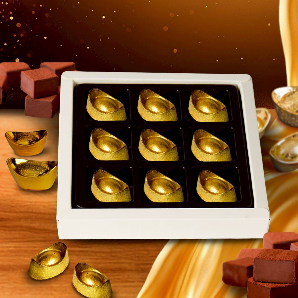 และ Ingot Nama Chocolate ‘กิมตุ้ง’ นพเก้า นามะช็อกโกแลตสดสูตรฮอกไกโด จากโกโก้ Organic เข้มข้น 72% ขึ้นรูปเป็นกิมตุ้งหรือเหรียญทองคำอันล้ำค่า ถ่ายทอดความหมายของความมั่งคั่ง ความเจริญรุ่งเรือง และร่ำรวย ส่งมอบในกล่องของขวัญ 9 ชิ้น เพียง 420 บาท