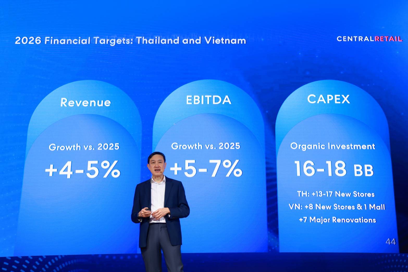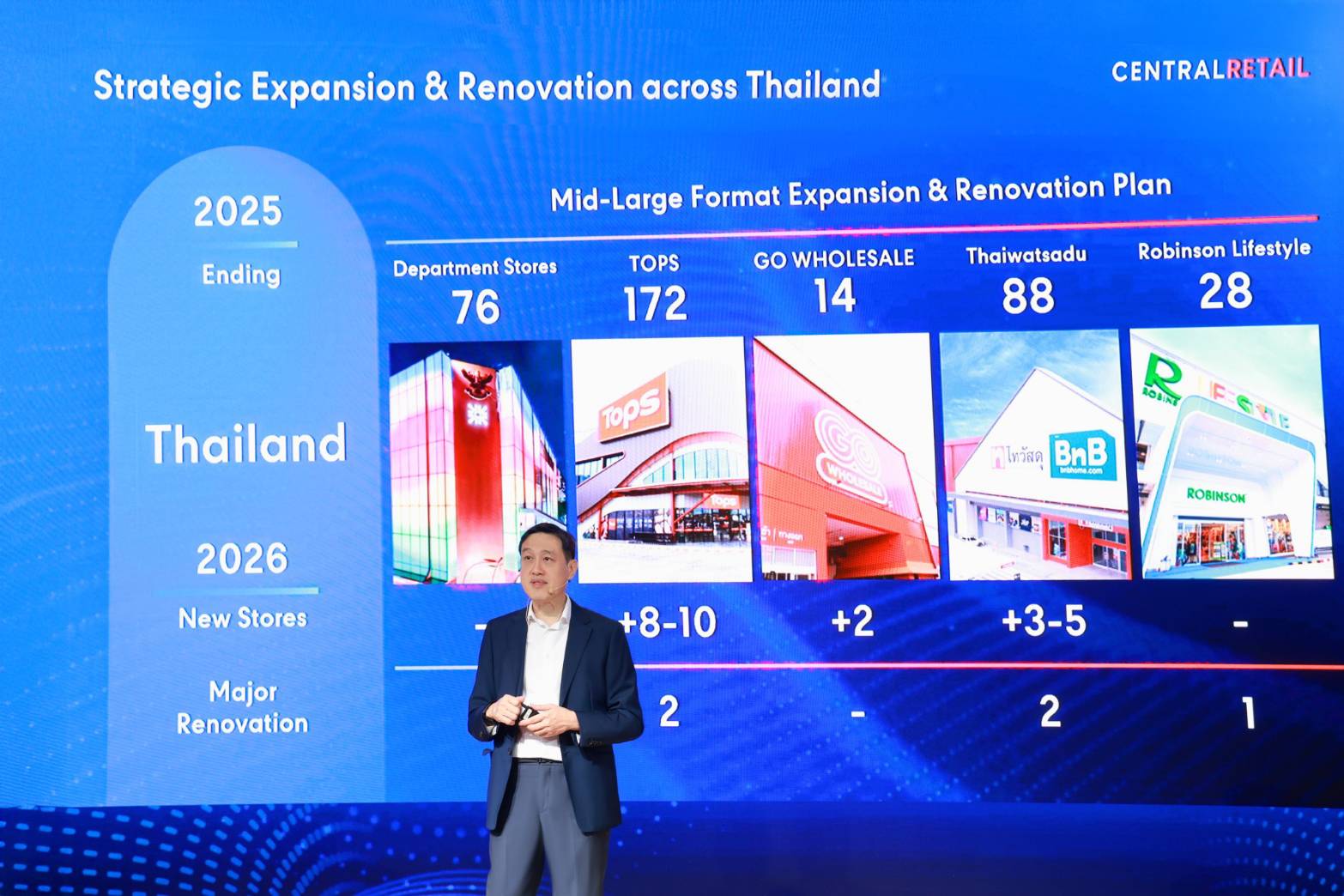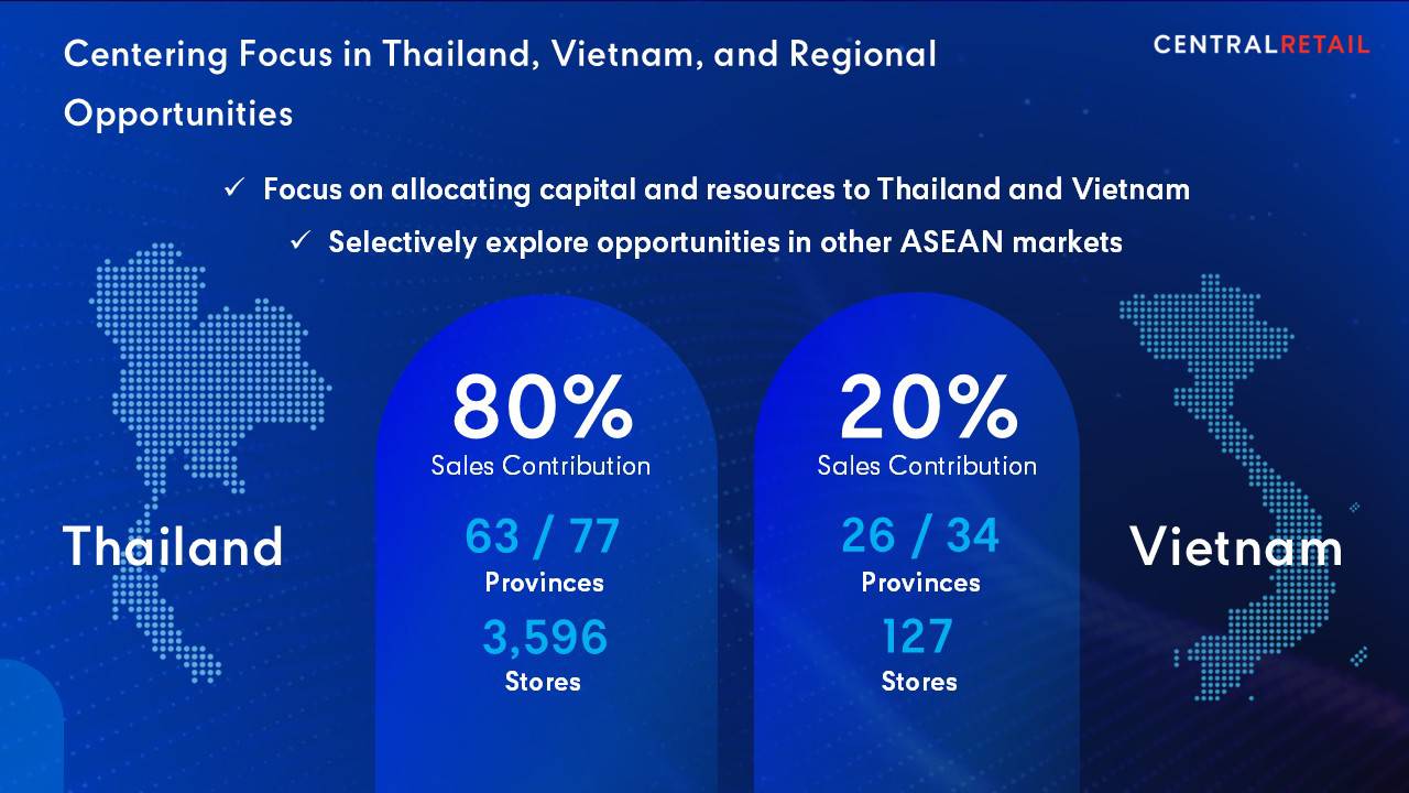 เพื่อสร้างการเติบโตอย่างแข็งแกร่งในปี 2569 เซ็นทรัล รีเทล ประกาศทุ่มงบลงทุน 16,000–18,000 ล้านบาท สำหรับการรีโนเวทและการขยายสาขาทั้งในประเทศไทยและเวียดนาม ซึ่งเป็นตลาดยุทธศาสตร์สำคัญ โดยวางแผนขยายสาขาใหม่ของท็อปส์ 8-10 สาขา, GO Wholesale 2 สาขา และไทวัสดุ 3-5 สาขา ส่วนในประเทศเวียดนาม มีแผนขยายสาขาศูนย์การค้า GO! 1 สาขา, ไฮเปอร์มาร์เก็ต GO! 2 สาขา และซูเปอร์มาร์เก็ต Mini go! 6 สาขา พร้อมทั้งมองหาโอกาสในการขยายธุรกิจในตลาดอาเซียนอื่น ๆ อย่างรอบคอบ โดยตั้งเป้าการเติบโตของรายได้ปี 2569 อยู่ที่ 4-5% และ EBITDA ที่ 5-7% เมื่อเทียบกับปีก่อนหน้า ทั้งนี้ เซ็นทรัล รีเทล ให้ความสำคัญกับการบริหารการเงินอย่างมีวินัยเพื่อสร้างยอดขายและกำไรที่มีคุณภาพ รักษาความแข็งแกร่งทางการเงินเพื่อรองรับโอกาสในการควบรวมและเข้าซื้อกิจการ (M&A) ในอนาคต พร้อมทั้งสร้างผลตอบแทนที่ยั่งยืนแก่ผู้ถือหุ้นอย่างต่อเนื่อง
