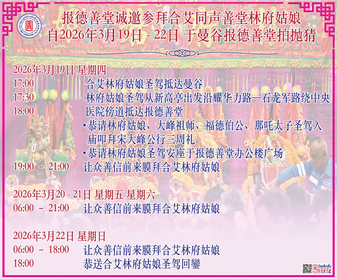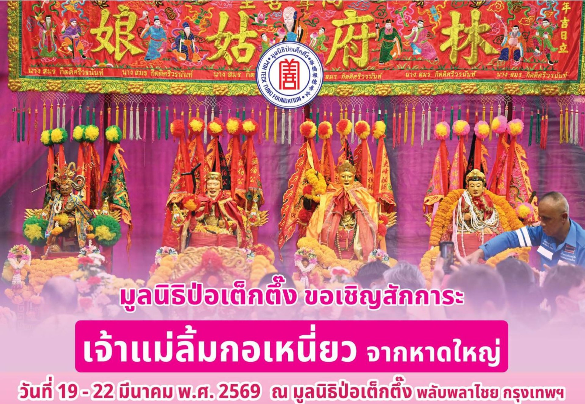 ระหว่างวันที่ 19 – 22 มีนาคม พ.ศ. 2569 มูลนิธิป่อเต็กตึ๊ง ร่วมกับมูลนิธิมิตรภาพสามัคคี (ท่งเซียเซี่ยงตึ๊ง) หาดใหญ่ ขอเชิญศิษยานุศิษย์ และสาธุชนที่เลื่อมใส ร่วมสักการะองค์เจ้าแม่ลิ้มกอเหนี่ยวจากหาดใหญ่ องค์หลวงปู่ไต้ฮงโจวซือ องค์ฮกเต็กแป๊ะกง และองค์นาจาไท้จื้อ (เทพโกมินทร์) ณ บริเวณลานสำนักงาน มูลนิธิป่อเต็กตึ๊ง พลับพลาไชย กรุงเทพฯ โดยในวันพฤหัสบดีที่ 19 มีนาคม พ.ศ. 2569 เวลาประมาณ 17.00 น. คณะเจ้าแม่ลิ้มกอเหนี่ยวเดินทางถึงกรุงเทพฯ เคลื่อนขบวนผ่านบริเวณวงเวียนโอเดียน ไปตามถนนเยาวราช เจริญกรุง โดยขบวนจะแห่ถึงมูลนิธิป่อเต็กตึ๊ง และเปิดให้ผู้มีจิตศรัทธาเข้าสักการะ เวลาประมาณ 18.00 น. และในวันศุกร์ที่ 20 มีนาคม - วันเสาร์ที่ 21 มีนาคม พ.ศ. 2569 มูลนิธิป่อเต็กตึ๊งเปิดให้ผู้มีจิตศรัทธาเข้าสักการะตั้งแต่เวลา 06.00 – 21.00 น. สำหรับวันอาทิตย์ที่ 22 มีนาคม พ.ศ. 2569 เวลาประมาณ 18.00 น. จะมีพิธีส่งเจ้าแม่ลิ้มกอเหนี่ยวกลับหาดใหญ่