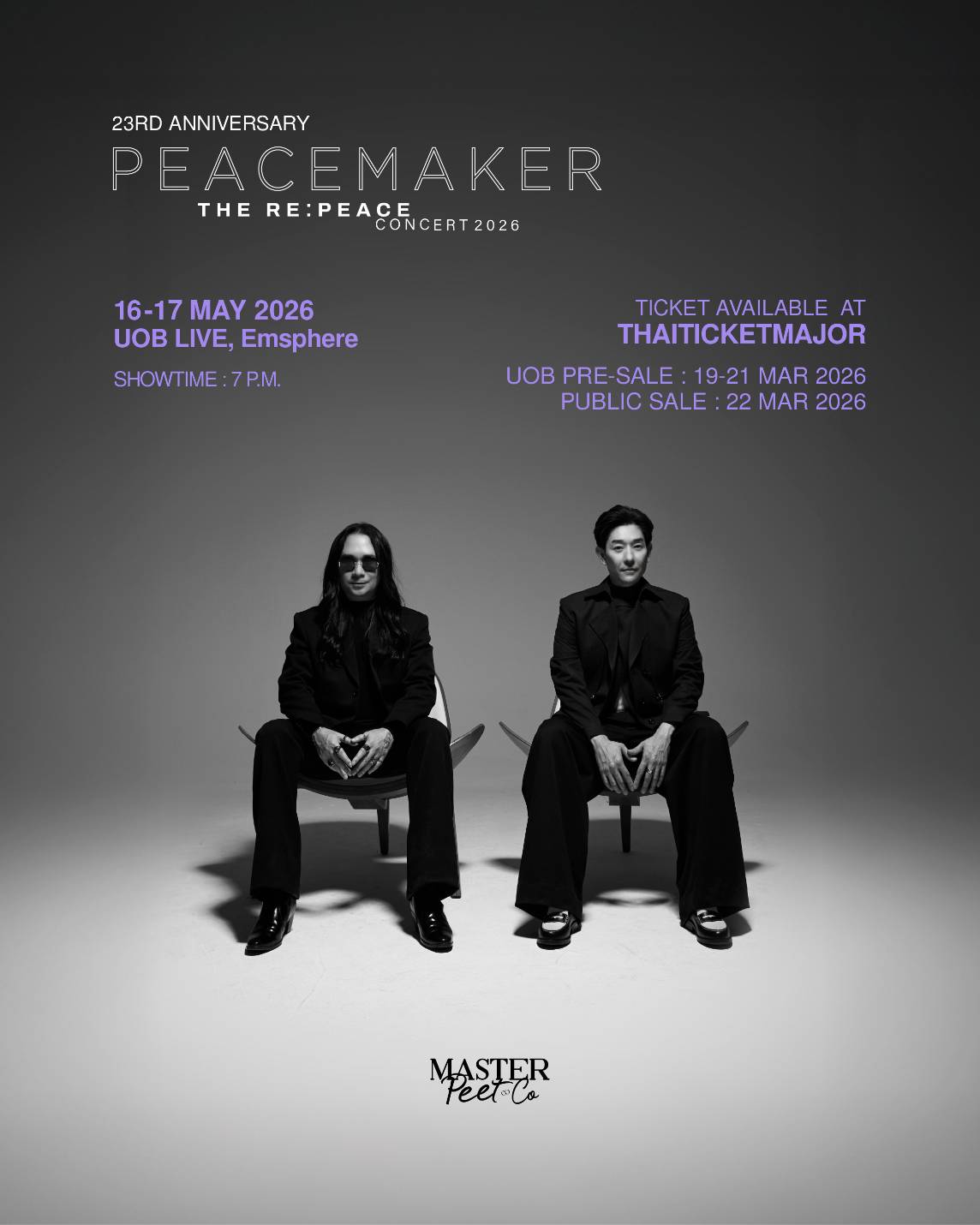 PEACEMAKER THE RE:PEACE CONCERT คอนเสิร์ตคุณภาพ ที่คอคอนเสิร์ตรอคอยด้วยความคิดถึง จัดโดย บริษัท มาสเตอร์พีธ แอนด์ โค จำกัด (MASTERPEET & CO Co., Ltd.) ที่จะสปอยทุกความประทับใจด้วยโปรดักชันจัดเต็มทุกรูปแบบ พร้อมเสิร์ฟความสนุกสุดเหวี่ยงและเสียงหัวเราะจากแขกรับเชิญพิเศษ ในโมเมนต์ที่คุณจะไม่มีวันลืม...