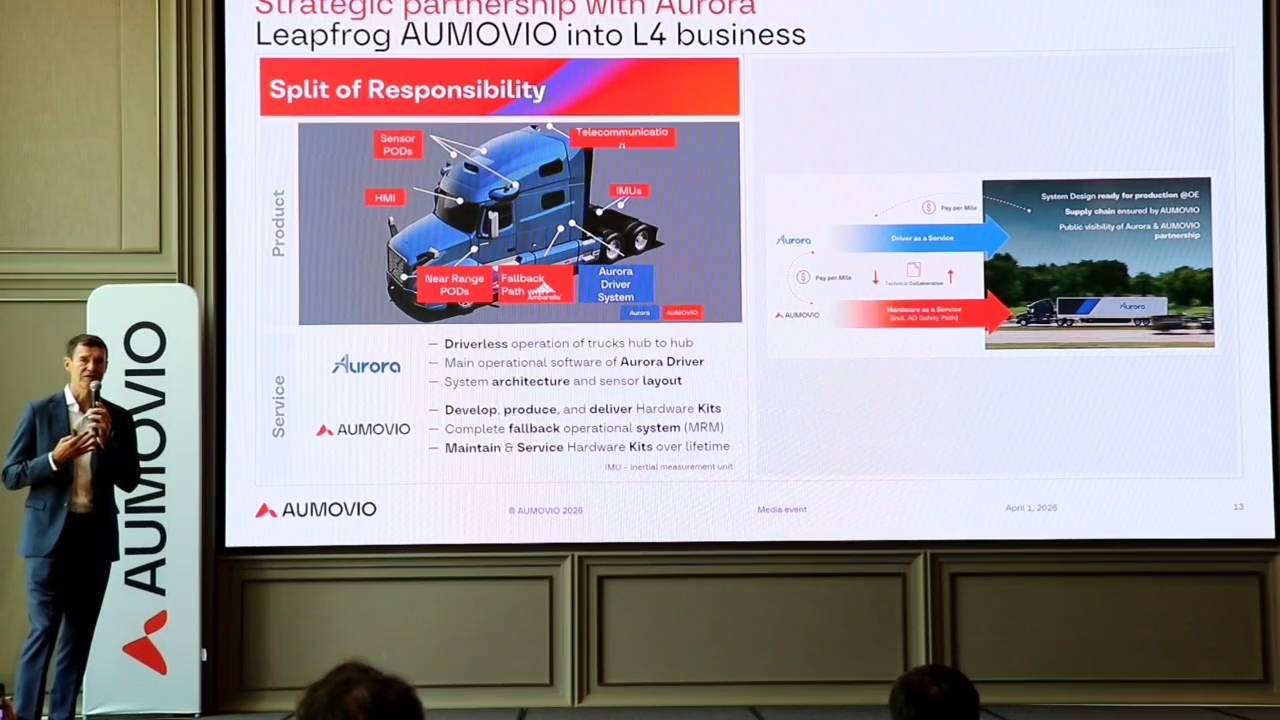 ในโอกาสเปิดตัวอย่างเป็นทางการในประเทศไทย AUMOVIO ยังได้นำเสนอเทคโนโลยีแห่งอนาคตผ่าน innovation showcase ที่รวบรวมโซลูชันรุ่นใหม่ ซึ่งสะท้อนให้เห็นว่าโลกของการเดินทางกำลังก้าวสู่ความชาญฉลาด ใช้งานง่าย และผสานเข้ากับประสบการณ์การขับขี่จริงได้อย่างกลมกลืนมากยิ่งขึ้น หนึ่งในไฮไลต์สำคัญคือโซลูชันรถบรรทุกขับเคลื่อนอัตโนมัติที่สามารถต่อยอดเชิงพาณิชย์ ซึ่งพัฒนาร่วมกับ Aurora โดยทั้งสองบริษัทจะร่วมกันออกแบบ พัฒนา ทดสอบ ส่งมอบและให้บริการระบบขับเคลื่อนอัตโนมัติสำหรับอุตสาหกรรมรถบรรทุก ทั้งนี้ ระบบดังกล่าวคาดว่าจะพร้อมให้บริการแก่ผู้ให้บริการขนส่ง และผู้ประกอบการฟลีทรถเชิงพาณิชย์ในสหรัฐอเมริกา และมีส่วนช่วยลดต้นทุนเพื่อสนับสนุนการใช้งานในวงกว้าง
