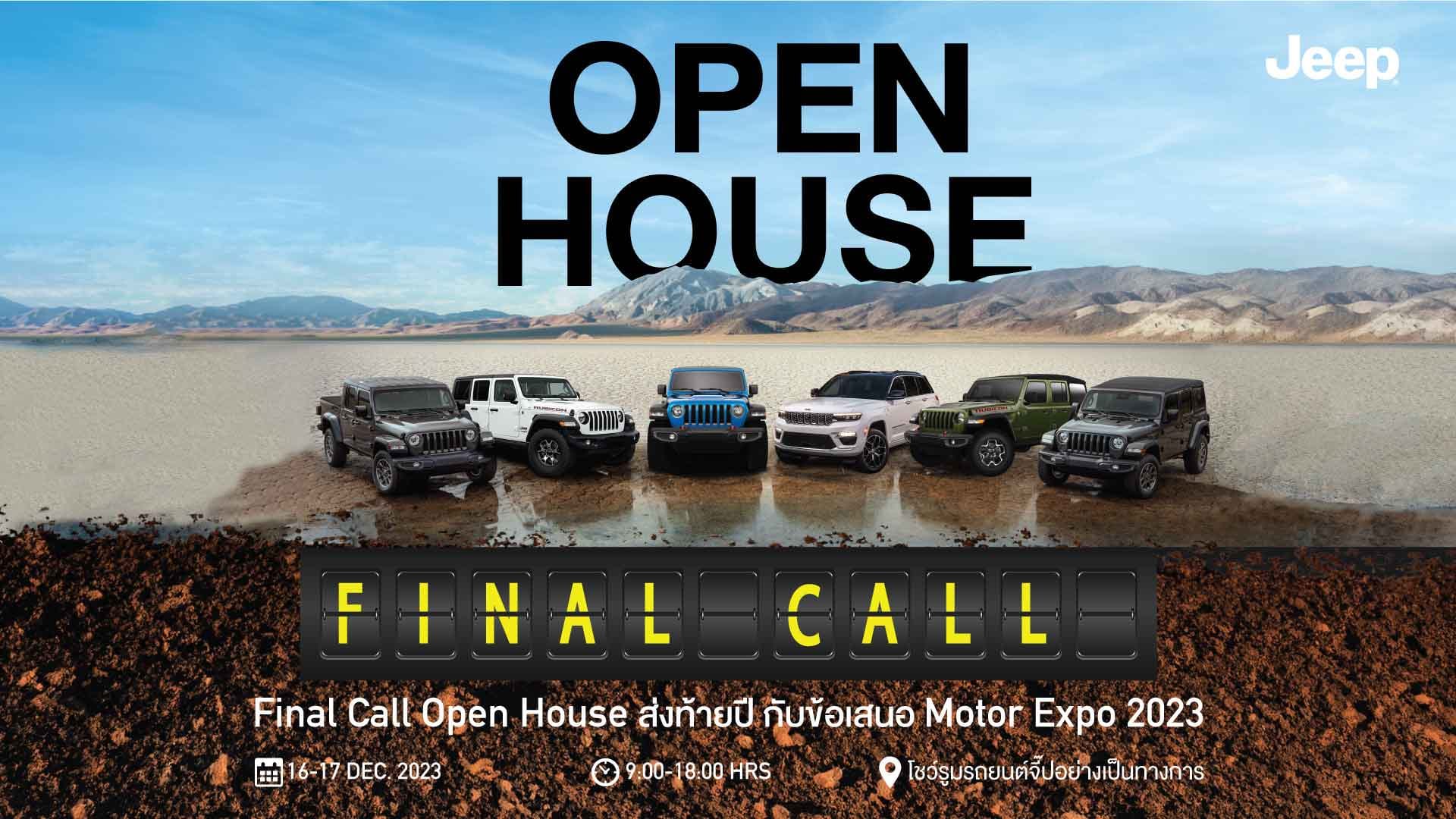 จี๊ป ประเทศไทย ผู้นำเข้าและจัดจำหน่ายรถยนต์ จี๊ป ราชาออฟ-โรดสัญชาติอเมริกัน อย่างเป็นทางการในประเทศไทย จัดกิจกรรมพิเศษ Jeep Final Call Open House ชวนผู้หลงใหลยอดรถยนต์สายพันธุ์แกร่ง สัมผัสและทดลองขับรุ่นที่ใช่ พร้อมมอบความคุ้มค่าส่งท้ายปี จองสิทธิ์ซื้อและออกรถวันนี้ รับข้อเสนอเดียวกับ มอเตอร์ เอ็กซ์โป 2023 และอีกมากมาย