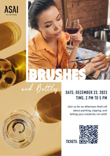 กิจกรรม Brushes & Bottles จัดขึ้นในวันที่ 23 ธันวาคม 2564 เวลา 14:00-17:00 น. ในราคา Early Bird เริ่มต้นเพียง 899 บาทต่อท่าน (รวมแคนวาส สีและพู่กัน พร้อมคำแนะนำจากผู้เชี่ยวชาญอย่างใกล้ชิด และไวน์สองแก้วฟรี) หรือเพลิดเพลินกับไวน์แบบไม่จำกัดได้ในราคา 1,399 บาทต่อท่าน งานจัดขึ้นที่ลานกิจกรรมบริเวณล็อบบี้ ของโรงแรมอาศัย กรุงเทพ ไชน่าทาวน์