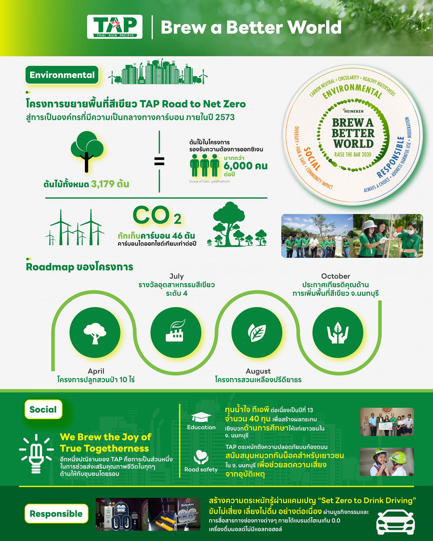 บริษัท ไทยเอเชีย แปซิฟิค บริวเวอรี่ จำกัด หรือทีเอพี บริษัทผู้ผลิต นำเข้า และจัดจำหน่ายแบรนด์เครื่องดื่มระดับโลก อาทิ ไฮเนเก้น ไทเกอร์ เชียร์ส และกินเนสส์ โดยดำเนินธุรกิจในประเทศไทย ภายใต้การให้ความสำคัญในเรื่องของความยั่งยืน (Sustainability) สอดคล้องกับแผนแม่บท Brew a Better World จากไฮเนเก้น มุ่งมั่นพัฒนาความยั่งยืนผ่านแผนดำเนินงานด้านสิ่งแวดล้อม (Environmental) สังคม (Social) และความรับผิดชอบ (Responsible) ซึ่งในปี 2566 ที่ผ่านมา ทีเอพี ได้สร้างผลกระทบเชิงบวกให้กับโลกโดยเฉพาะในพื้นที่ชุมชนโดยรอบโรงผลิต ผ่านโครงการนำร่องต่างๆ มากมาย