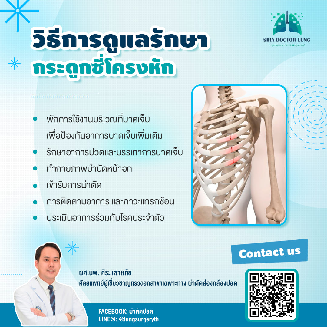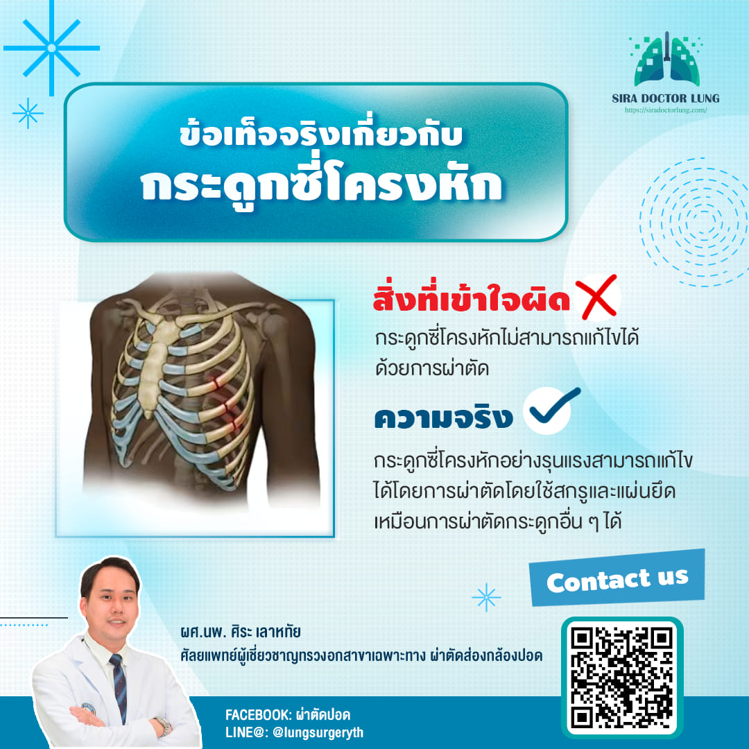ดังนั้นกระดูกซี่โครงหัก อย่างรุนแรงสามารถผ่าตัดแก้ไขได้ด้วยการผ่าตัด โดยใช้สกรูและแผ่นยึดเหมือนการผ่าตัดกระดูกในส่วนอื่น ๆ ได้ สำหรับผู้ที่ได้รับบาดเจ็บจากอุบัติเหตุจนถึงขั้นกระดูกซี่โครงหักที่กำลังตัดสินใจจะเข้ารับการผ่าตัดสามารถเข้ามาปรึกษาได้ที่เพจผ่าตัดปอด โดยนายแพทย์ศิระ หรือ Lineid : @lungsurgeryth
