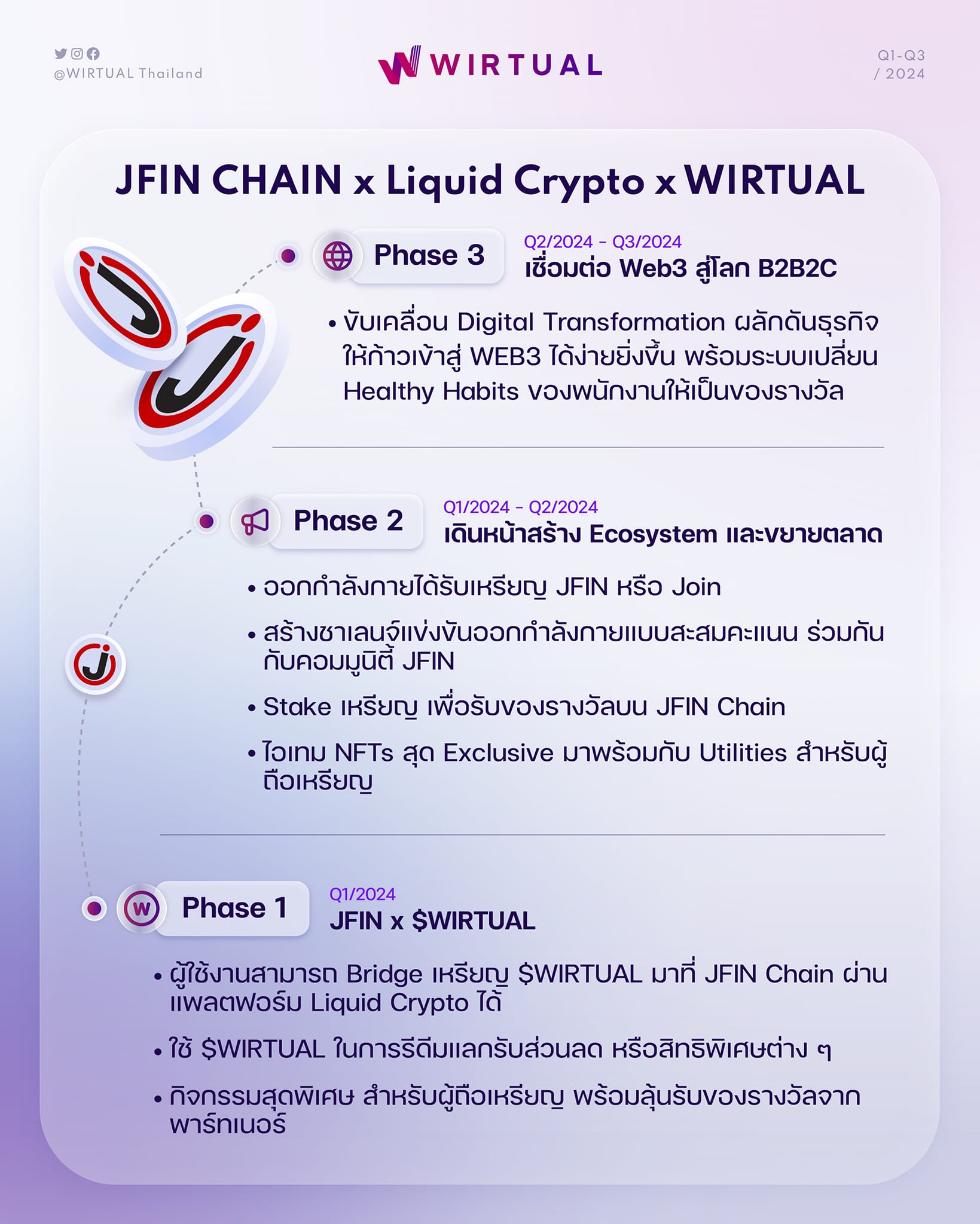 นายสุภชีพ พรวัฒนากูร ประธานเจ้าหน้าที่บริหาร และ Co-founder ของ WIRTUAL กล่าวถึงถึงแผนความร่วมมือในการพัฒนาโปรเจกต์ต่างๆ บน JFIN Chain ในครั้งนี้ โดยได้วางแผนการทำงานออกเป็น 3 ระยะ ได้แก่