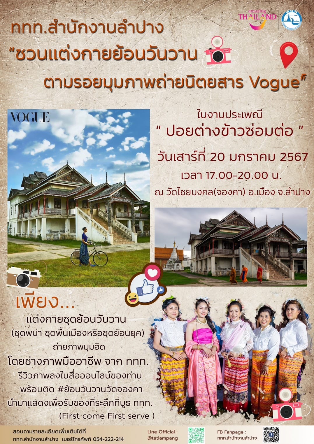 พร้อมกันนั้น ททท. ชวนแต่งกายย้อนวันวาน (ชุดพม่า ชุดพื้นเมืองหรือชุดย้อนยุค) ตามรอยมุมภาพถ่ายนิตยสารโวคฟรี! ในงานประเพณีปอยต่างข้าวซ่อมต่อ วัดศิลปะพม่าลำปาง ในวันเสาร์ที่ 20 มกราคม 2567 เวลา 17.00-20.00 น. ณ วัดจองคา (ไชยมงคล) มางานนี้ได้ทั้งเที่ยว ชิมอาหารถิ่น และถ่ายภาพมุมฮิต พร้อมรับไฟล์ภาพทันทีฟรี!!!