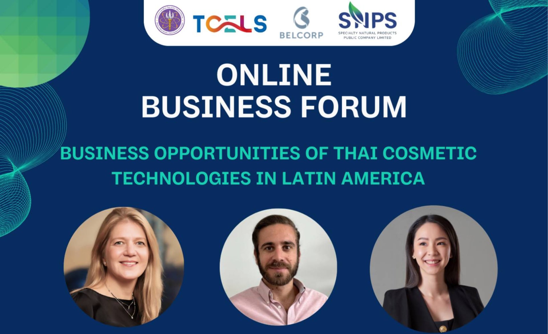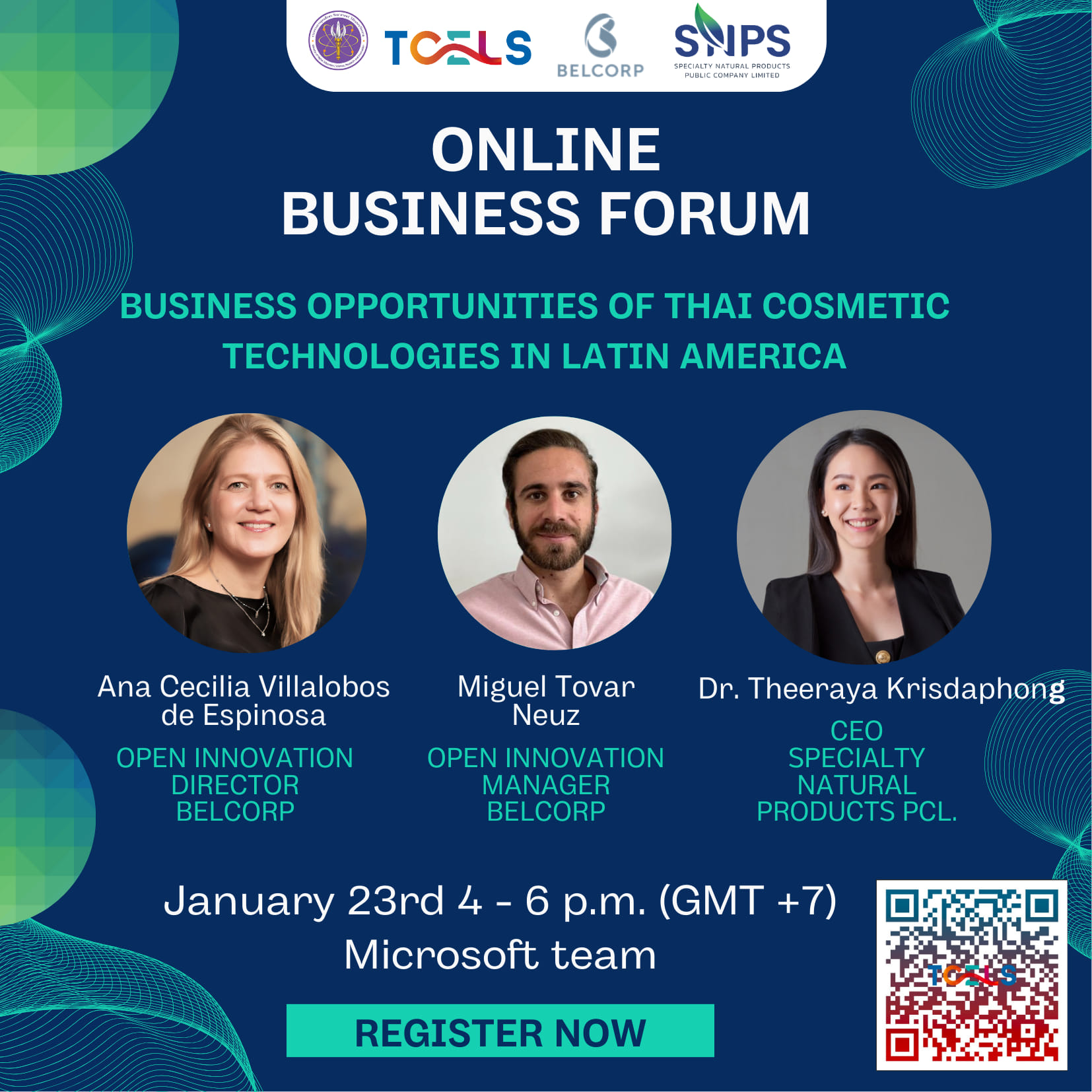 ศูนย์ความเป็นเลิศด้านชีววิทยาศาสตร์ (องค์การมหาชน) หรือ TCELS ร่วมกับ BELCORP และ SNPS จัด Online Business Forum ในหัวข้อ "Business Opportunities of Thai Cosmetic Technologies in Latin America" ว่าด้วยโอกาสทางธุรกิจของผู้ประกอบการด้านเวชสำอางของไทย ในการขยายธุรกิจสู่ละตินอเมริกา ในวันที่ 23 มกราคม 2567 เวลา 16.00-18.00 น. ผ่านช่องทาง microsoft team
