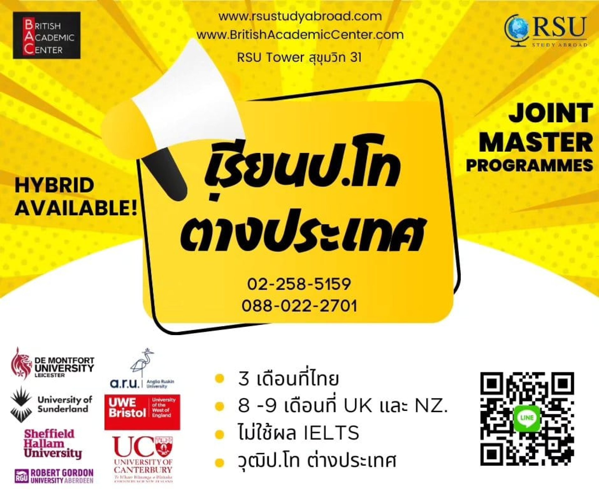 RSU Study Abroad วิทยาลัยนานาชาติ มหาวิทยาลัยรังสิต เปิดรับสมัครนักศึกษาใหม่ระดับปริญญาโท รุ่นที่ 22 เรียนต่อต่างประเทศกับหลักสูตรที่มีให้เลือกกว่า 50 สาขาวิชาเกี่ยวกับสายธุรกิจ กับมหาวิทยาลัยชั้นนำของประเทศอังกฤษ และนิวซีแลนด์ โดยเปิดรับสมัครแล้วตั้งแต่วันนี้เป็นต้นไป